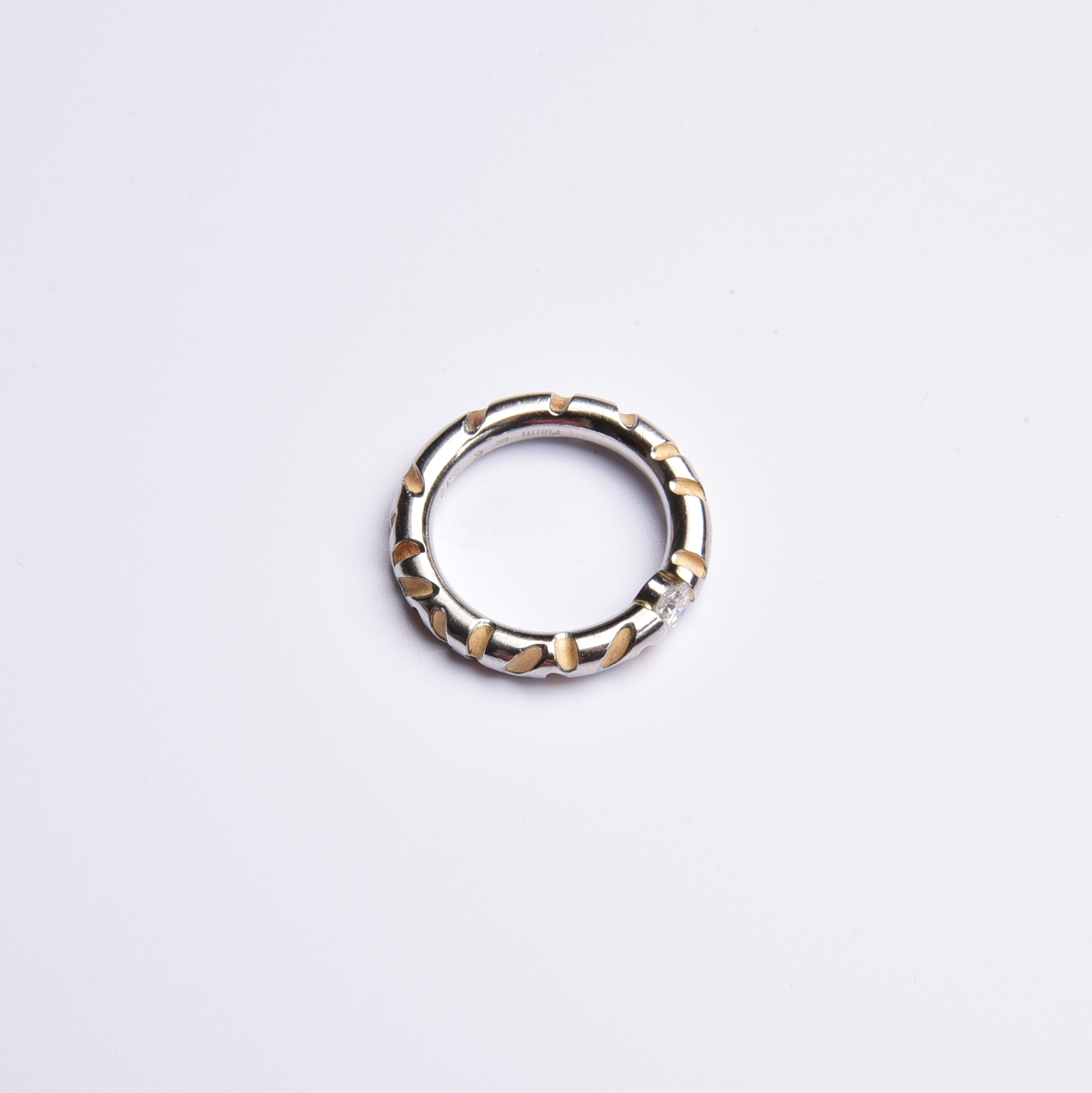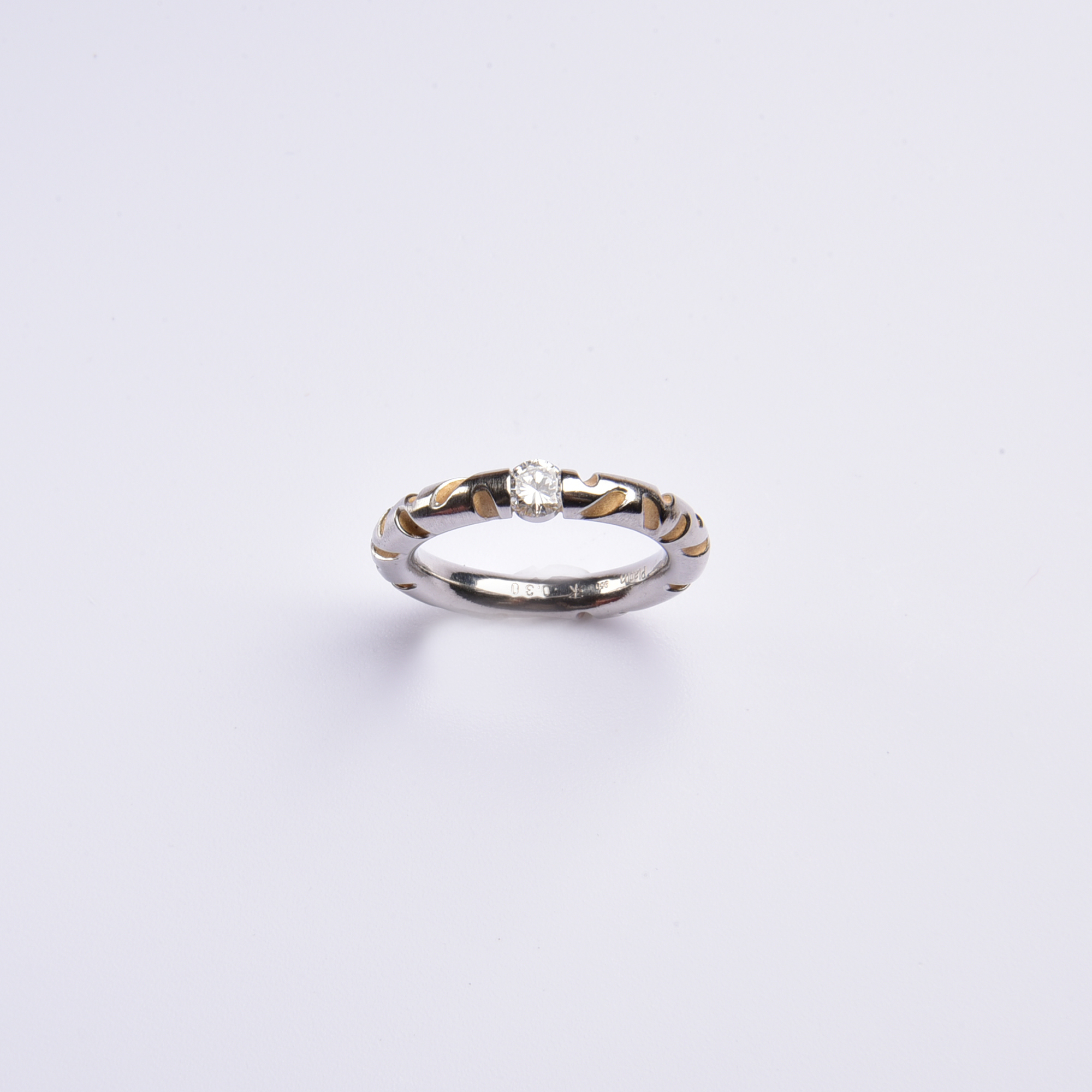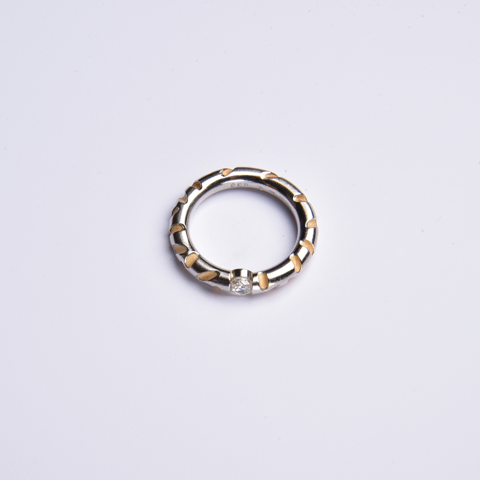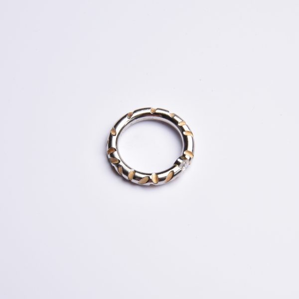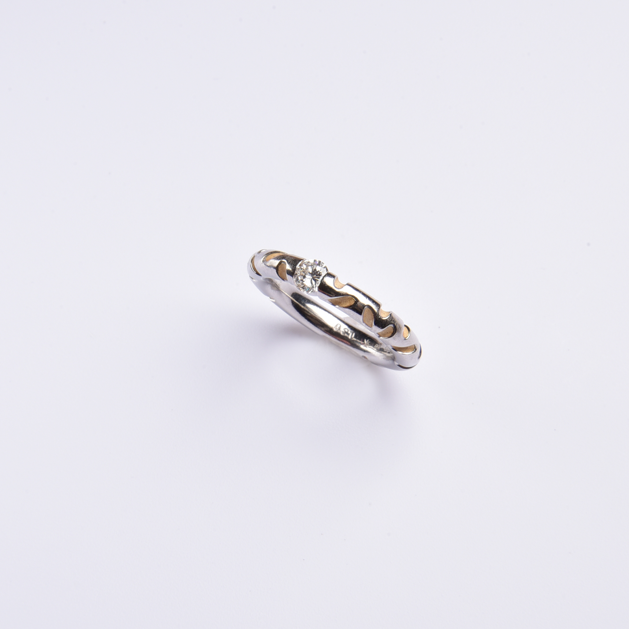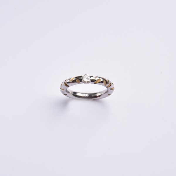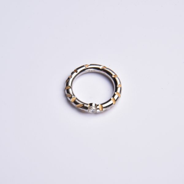 Aufwendig in kühlem Platin gestaltet, zeigen sich die feinen Kerbungen in weich schimmerndem 750 Gelbgold – mittig versprüht ein strahlender Brillant sein weißes Feuer.