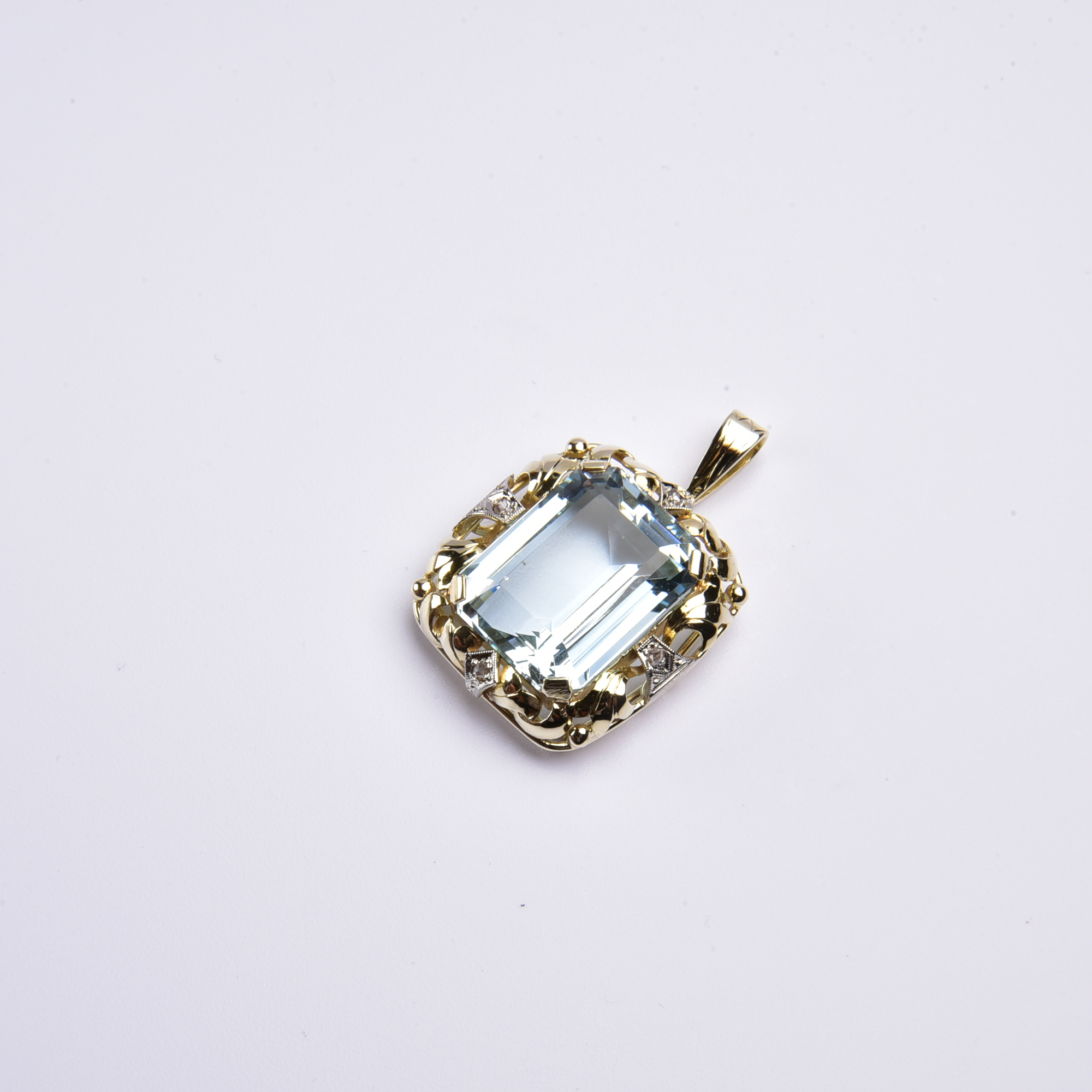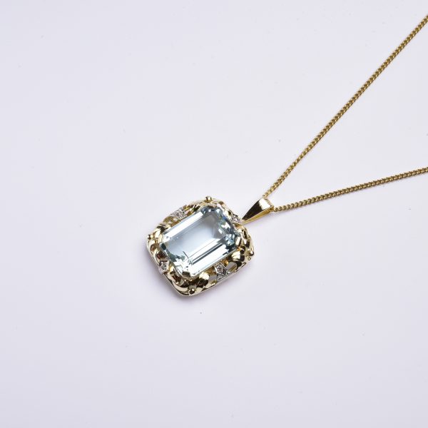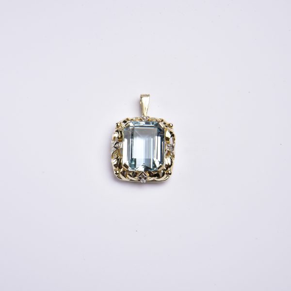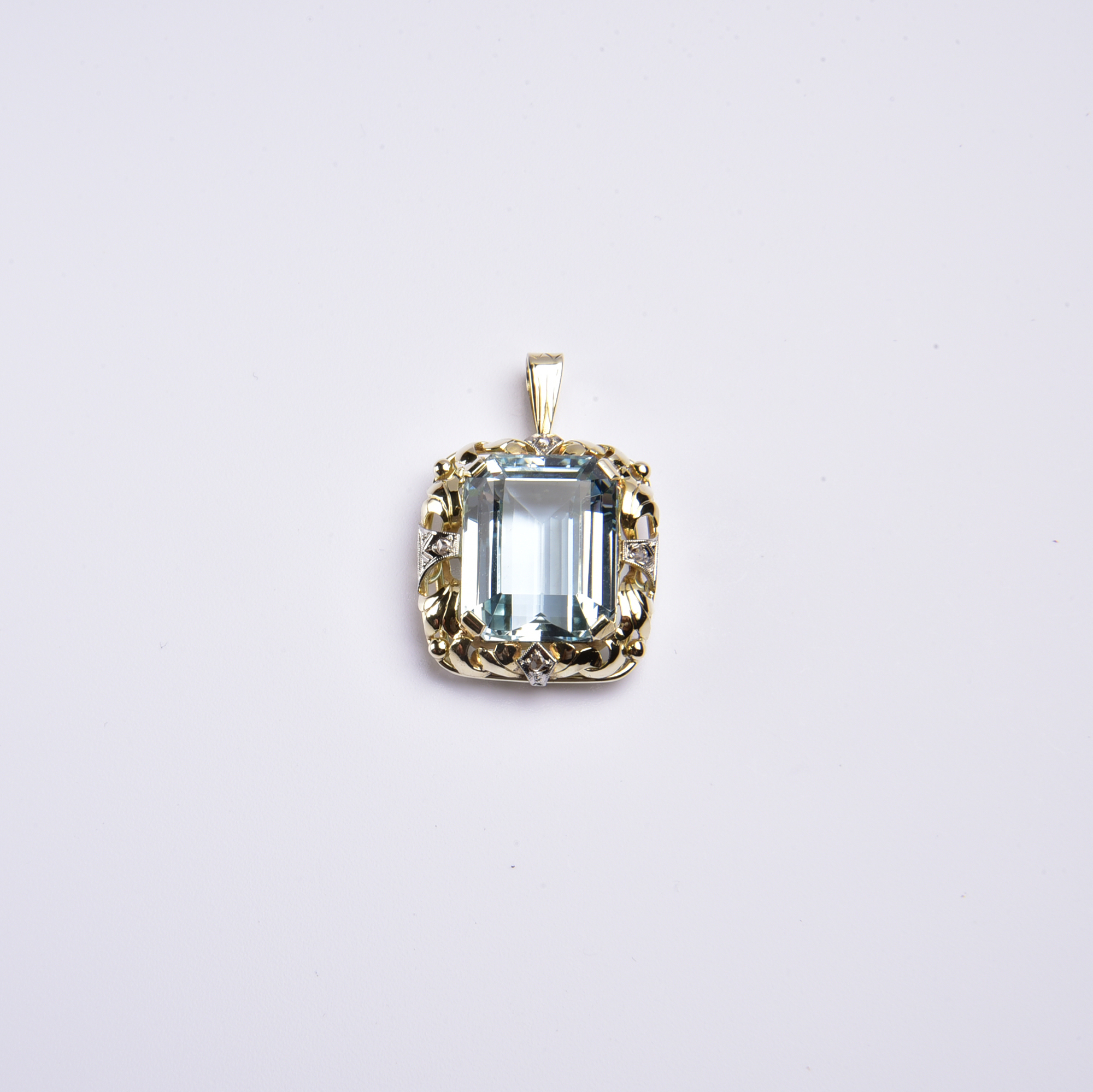 Bei diesem wunderschönen Anhänger, der in den Jahren um 1950 entstanden ist, wurde ein wasserblau leuchtender Aquamarin in eine ausdrucksstarke Goldumrahmung – zusätzlich mit zarten Diamantrosen geschmückt – aus 585 Gelbgold gesetzt.