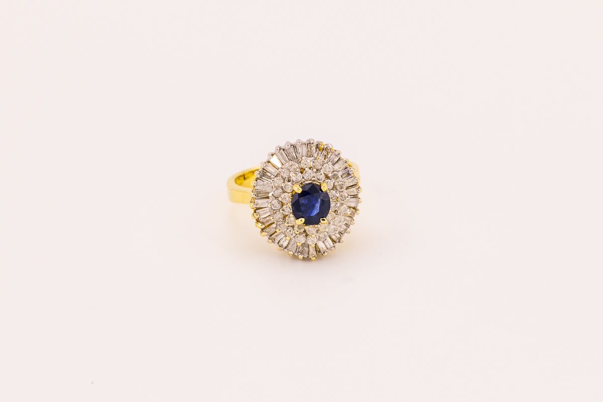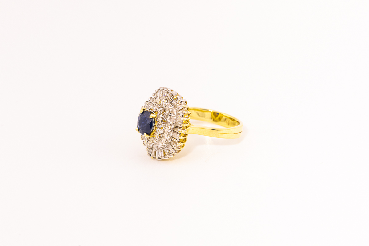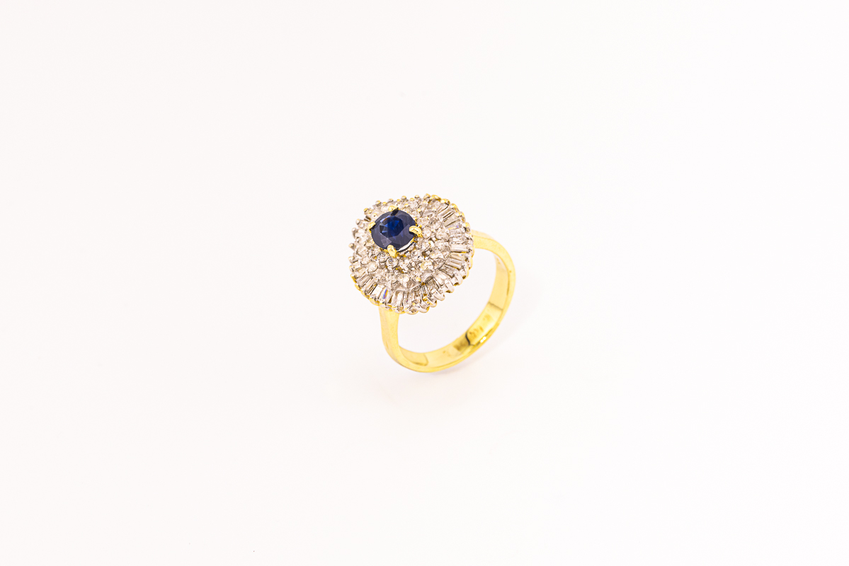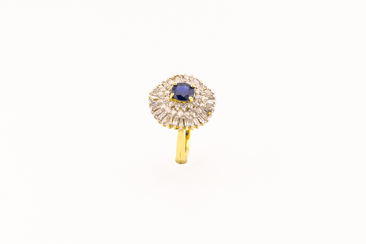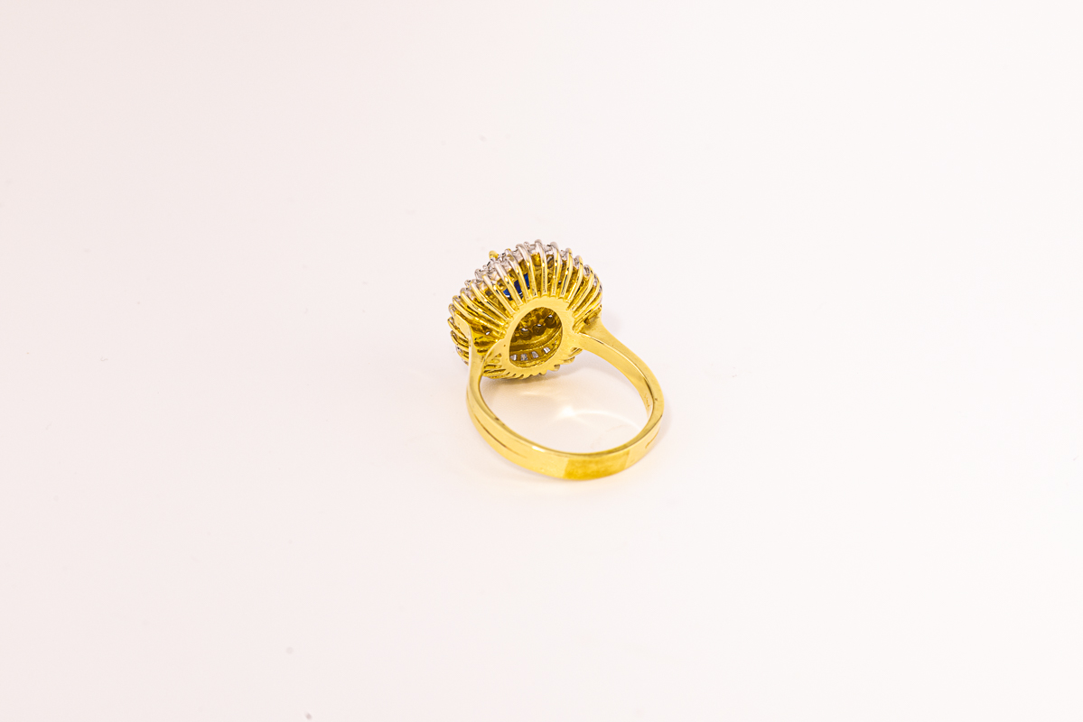 Extravagant gestaltet und exquisit gearbeitet, fasst er in zarten Krappen aus hochkarätigem Gelbgold einen wunderbaren, reich facettierten Saphir – perfekt ergänzt durch die Rahmung strahlender Brillanten mit loderndem Feuer.