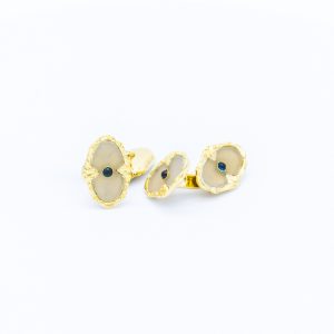 Leicht erhöht sitzt ein blauer Lapislazuli im Zentrum auf einer fein gearbeiteten Unterkaderung – umrahmt wird er von acht funkelnden Brillanten, die durch ihr weißes Licht das Blau des Mittelsteins hervorragend unterstreichen.