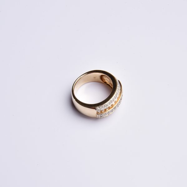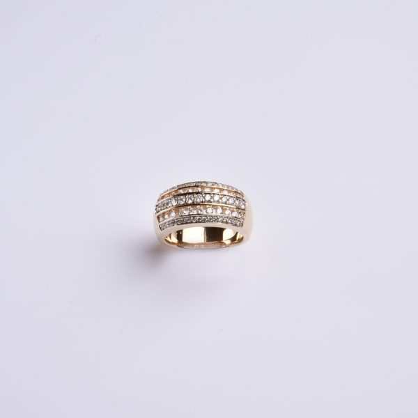 Auf einem quergelagerten Ringkopf präsentiert der luxuriös gestaltete Ring brillantbesetzte Bänder in unterschiedlichen Höhen.