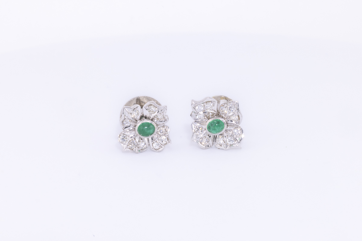 Zwei strahlend grüne Smaragde stehen im Mittelpunkt des exquisiten Entwurfs – luxuriös entouriert von weiß blitzenden Brillanten sind sie in das kühl schimmernde Gold gebettet und versprühen bei jeder Bewegung zahllose Lichtreflexe.