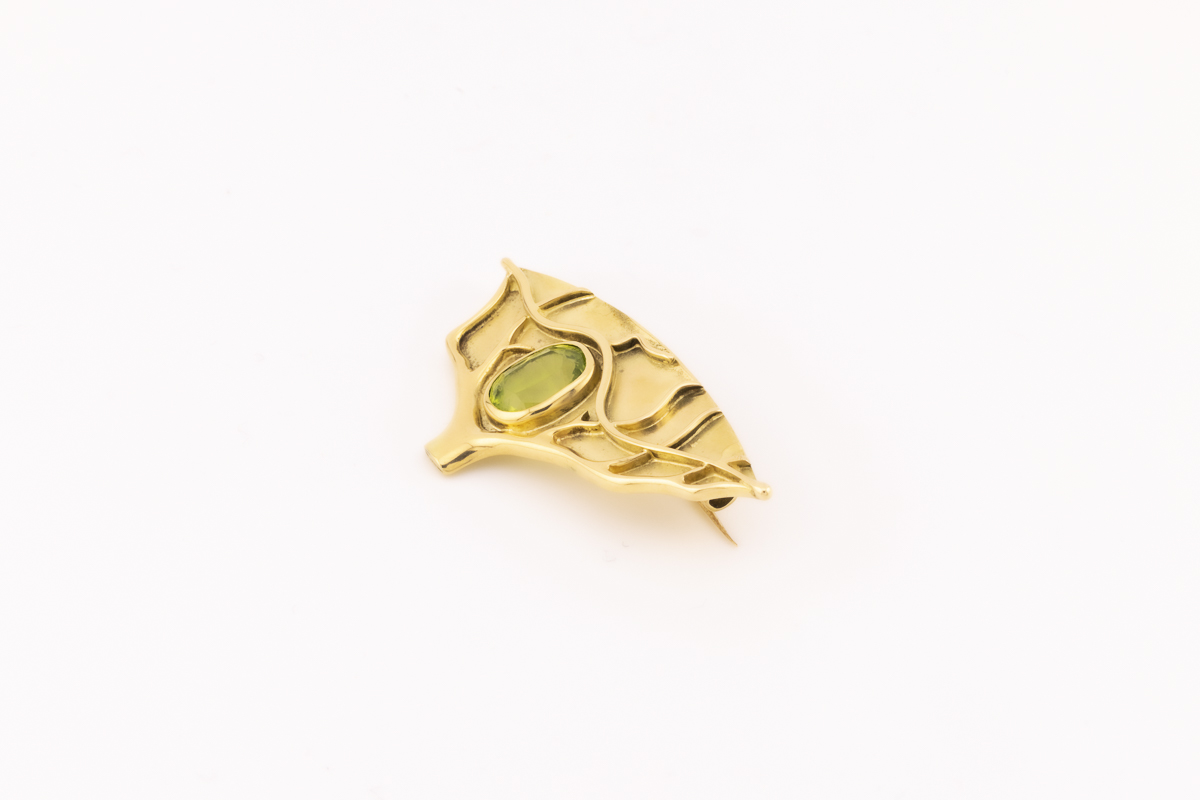 Wir stellen Ihnen hier eine Brosche mit einem wunderbar grün leuchtenden, reich facettierten Peridot vor!
