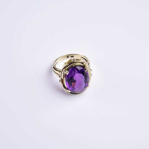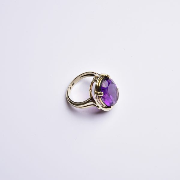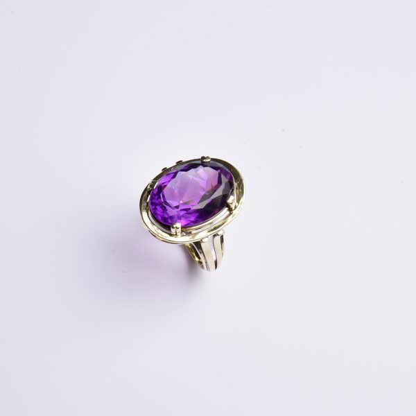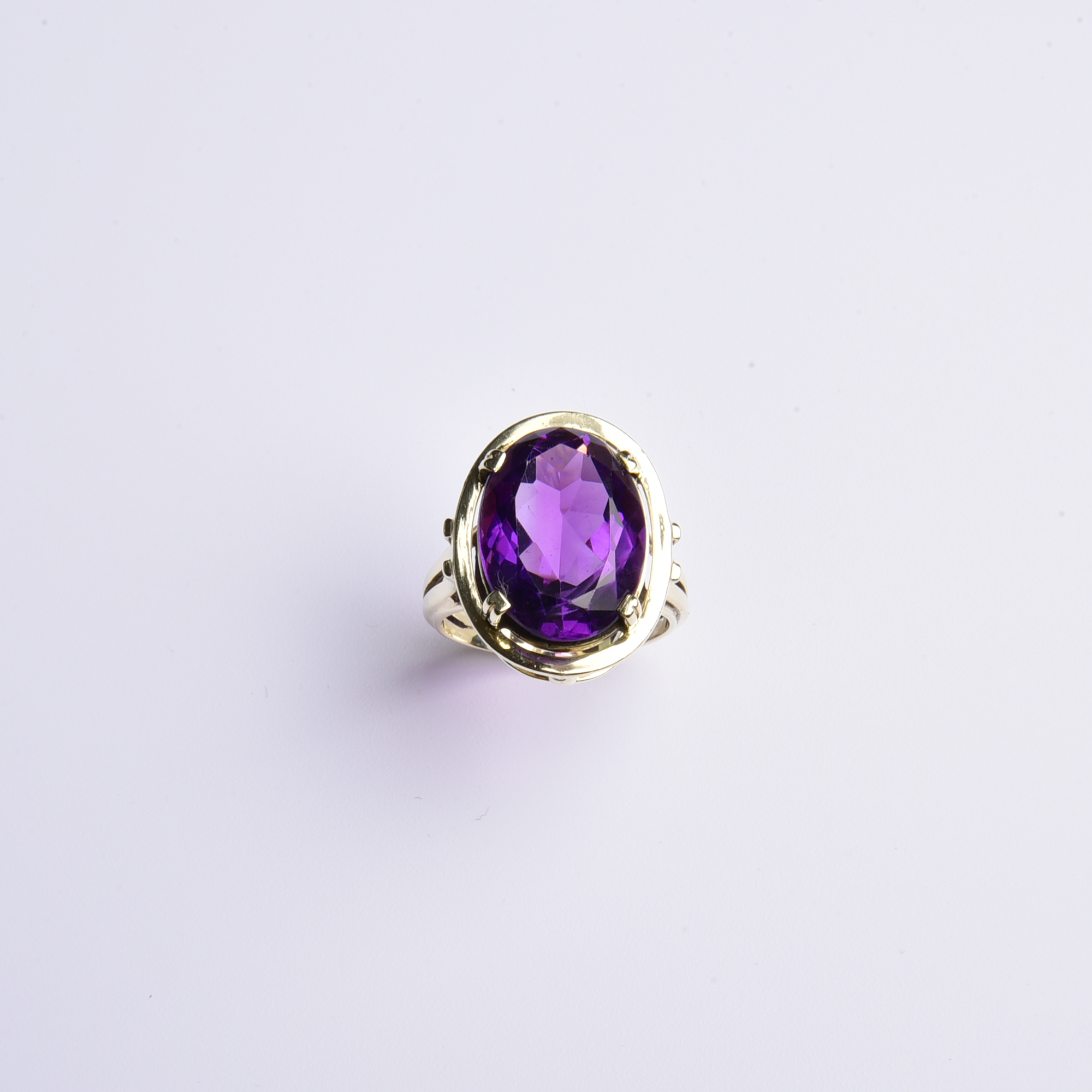 Der wunderbar farbintensive Amethyst präsentiert sich im ovalen Facettenschliff – hohe Krappen und eine aufwändig gestaltete Unterkaderung inszenieren den Edelstein perfekt und so reflektiert sich das Licht bei jeder Bewegung in allen Farbnuancen.