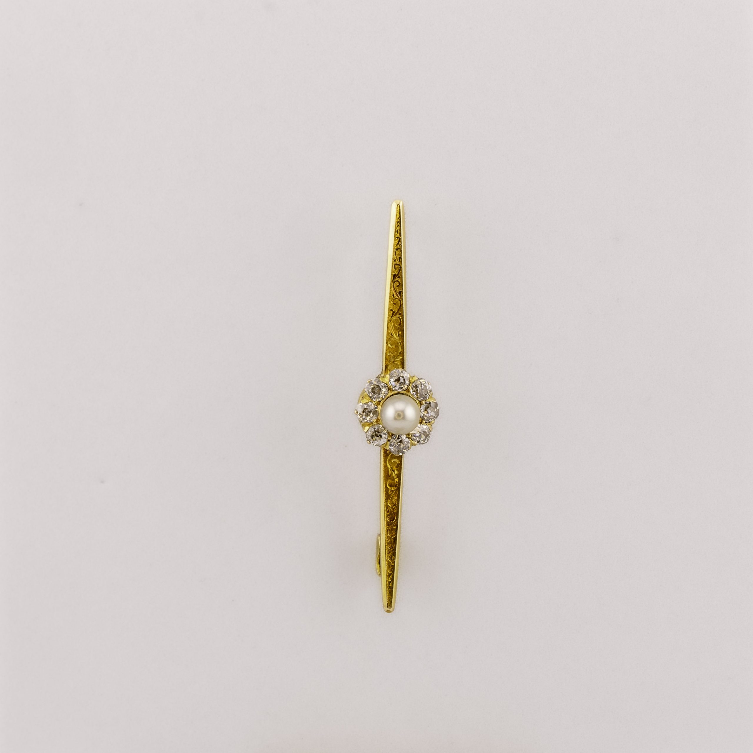 Die längliche Grundform ist mit feinen Ranken besetzt – mittig ist das kleine Kunstwerk mit einer feinweißen Naturperle und acht funkelnden Altschliff Diamanten (Old European Cut) luxuriös geschmückt.