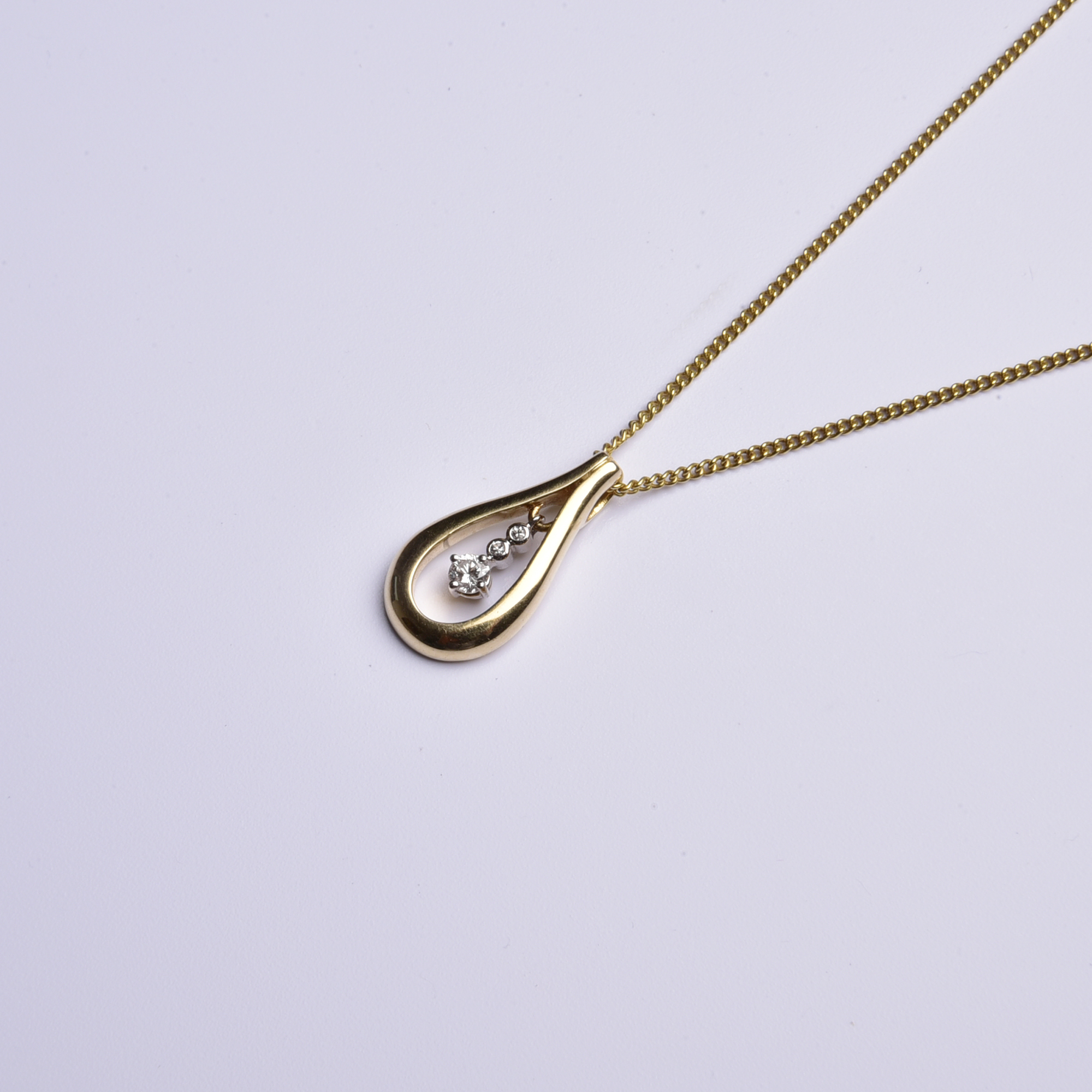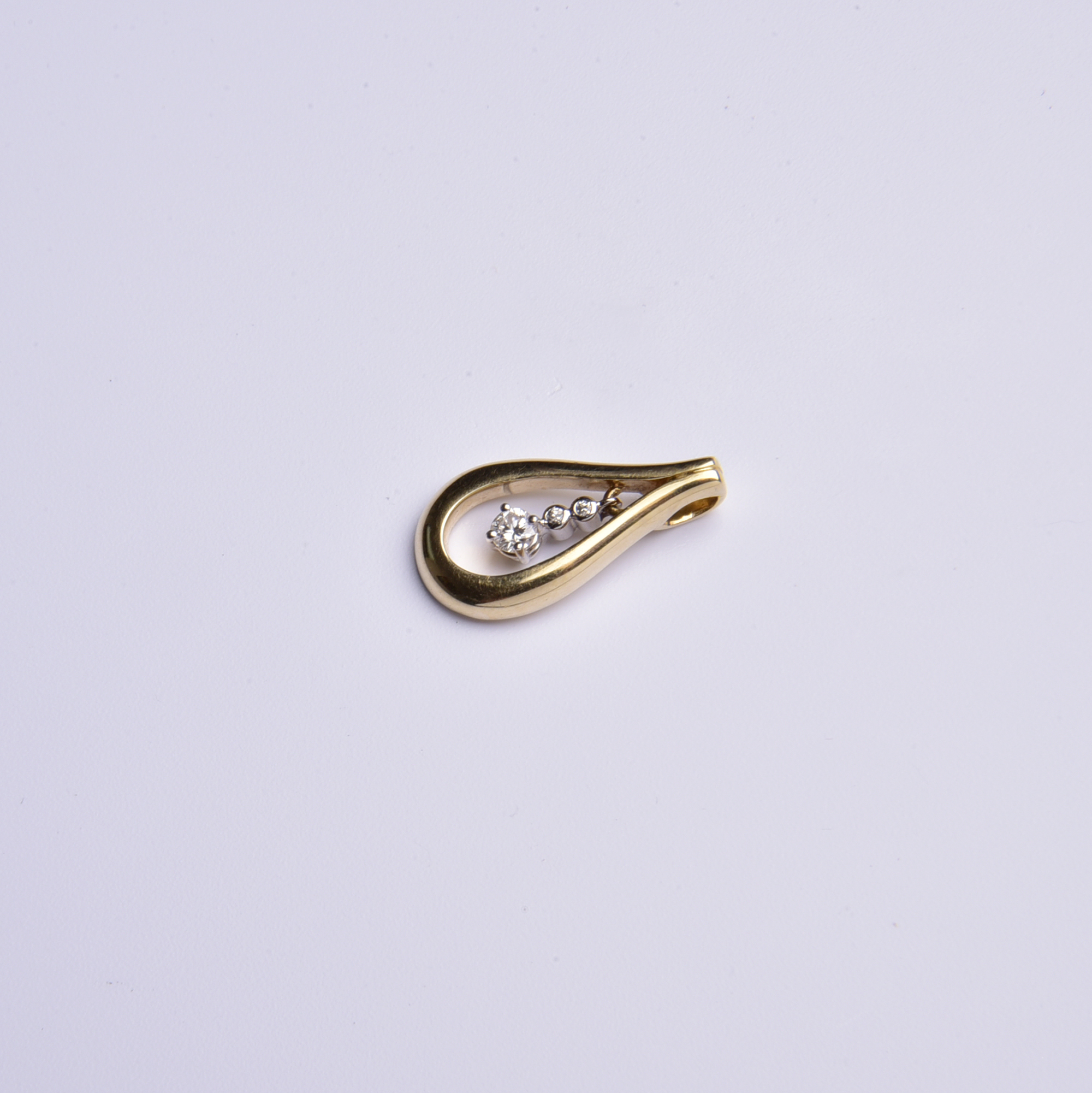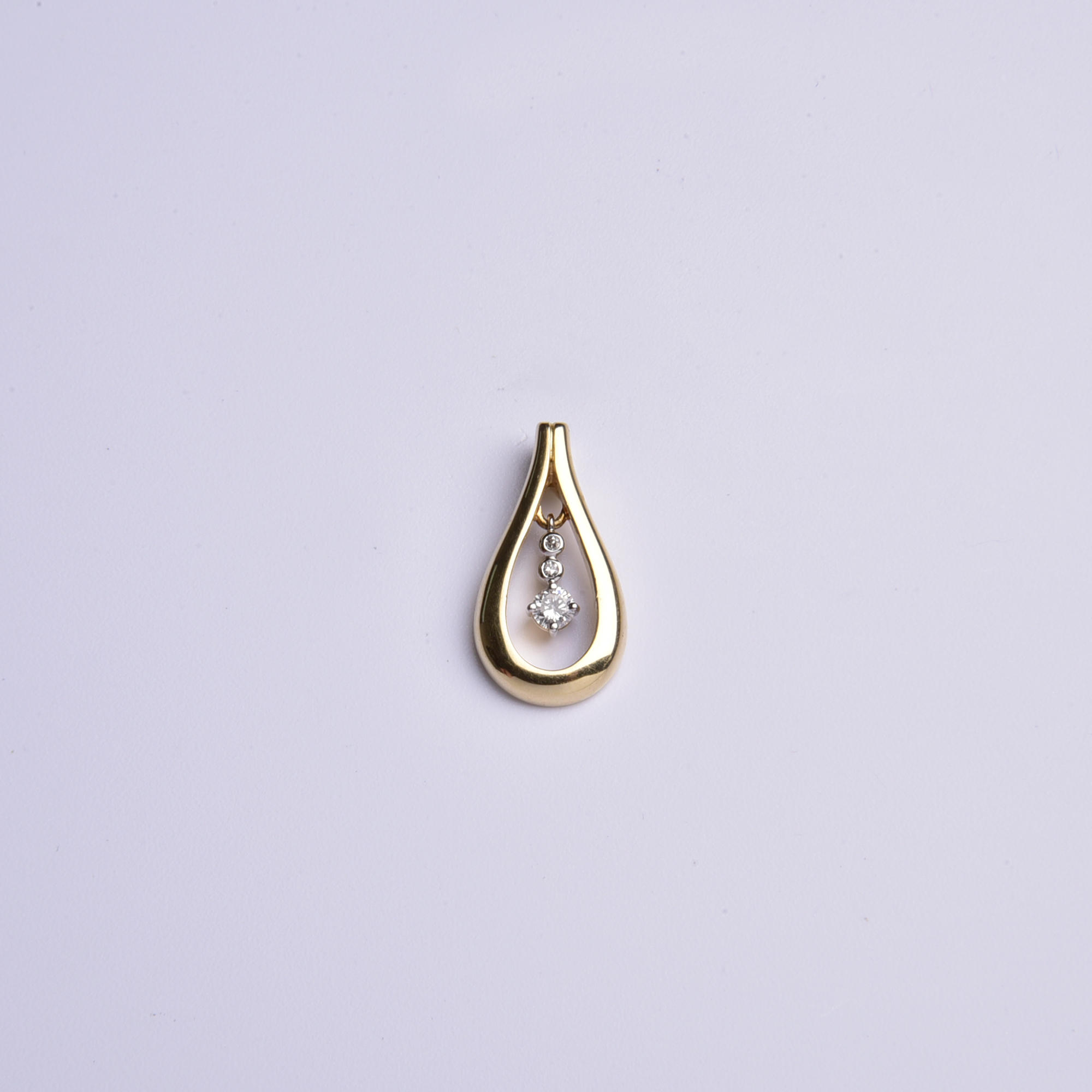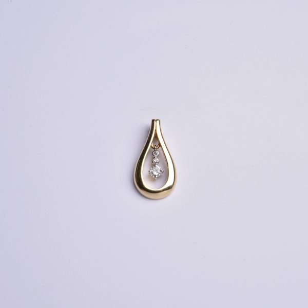 Er präsentiert in einer goldenen Tropfenform drei blitzende Brillanten, die bei jeder Bewegung ihr helles Licht verströmen.