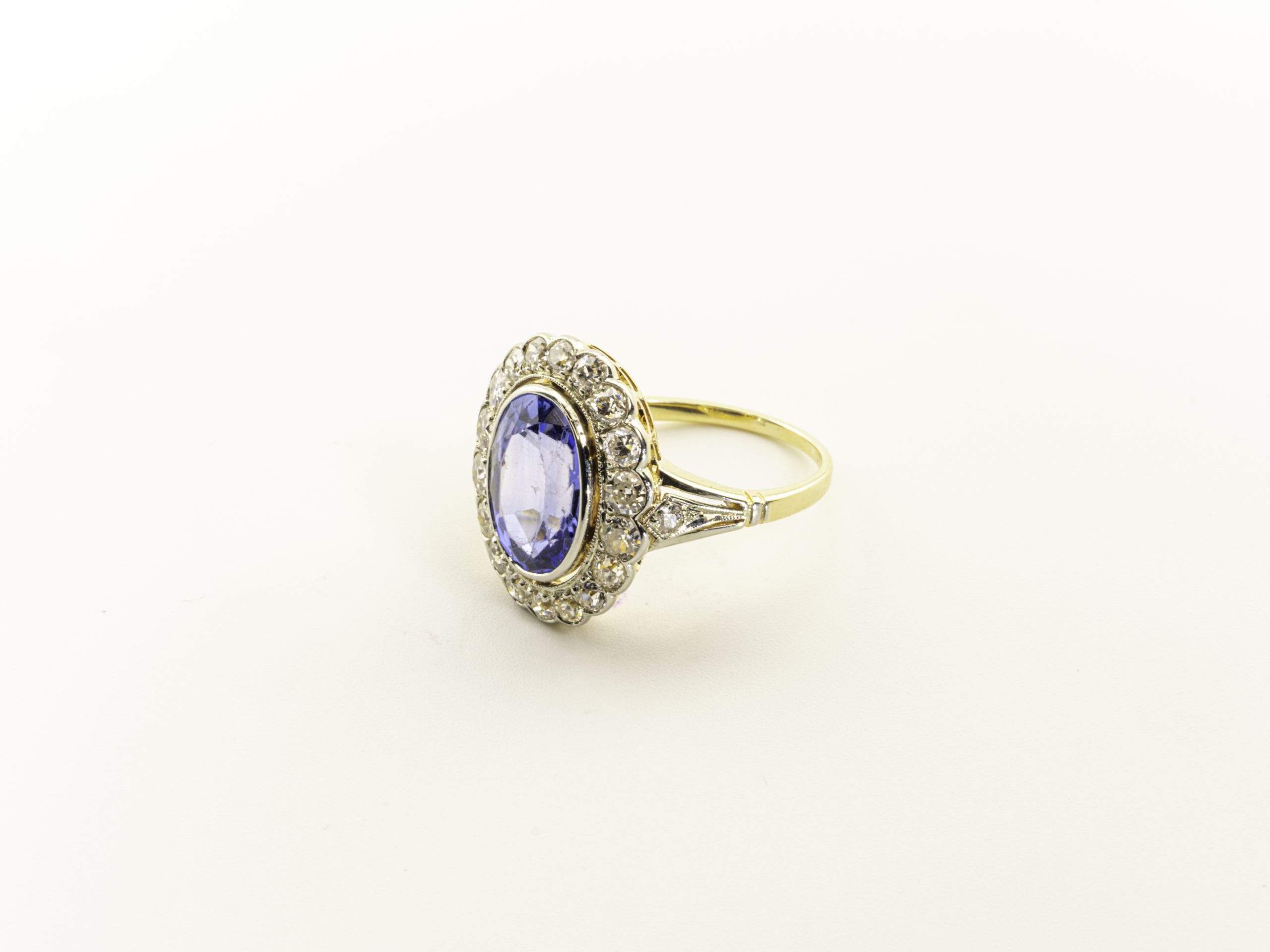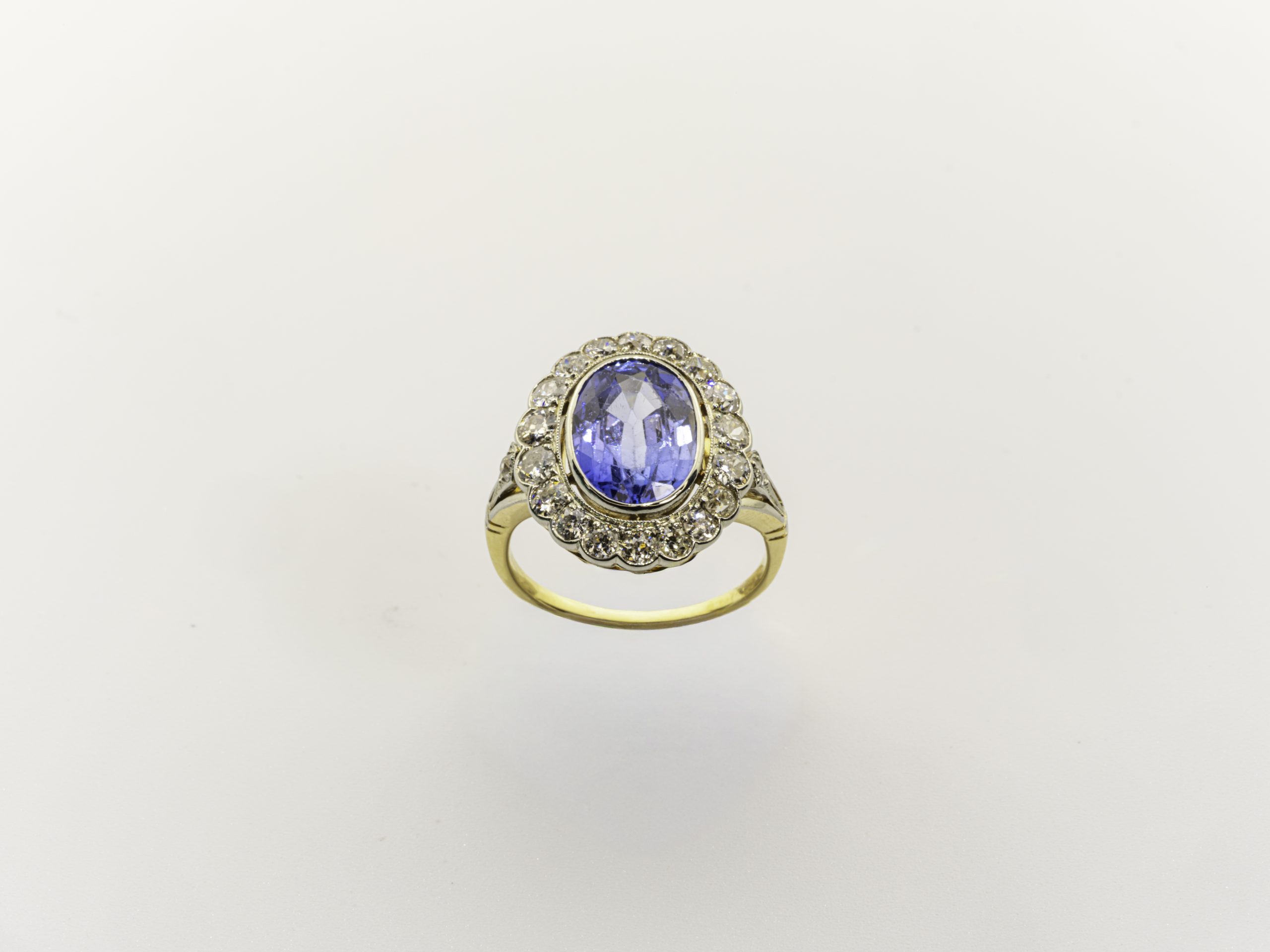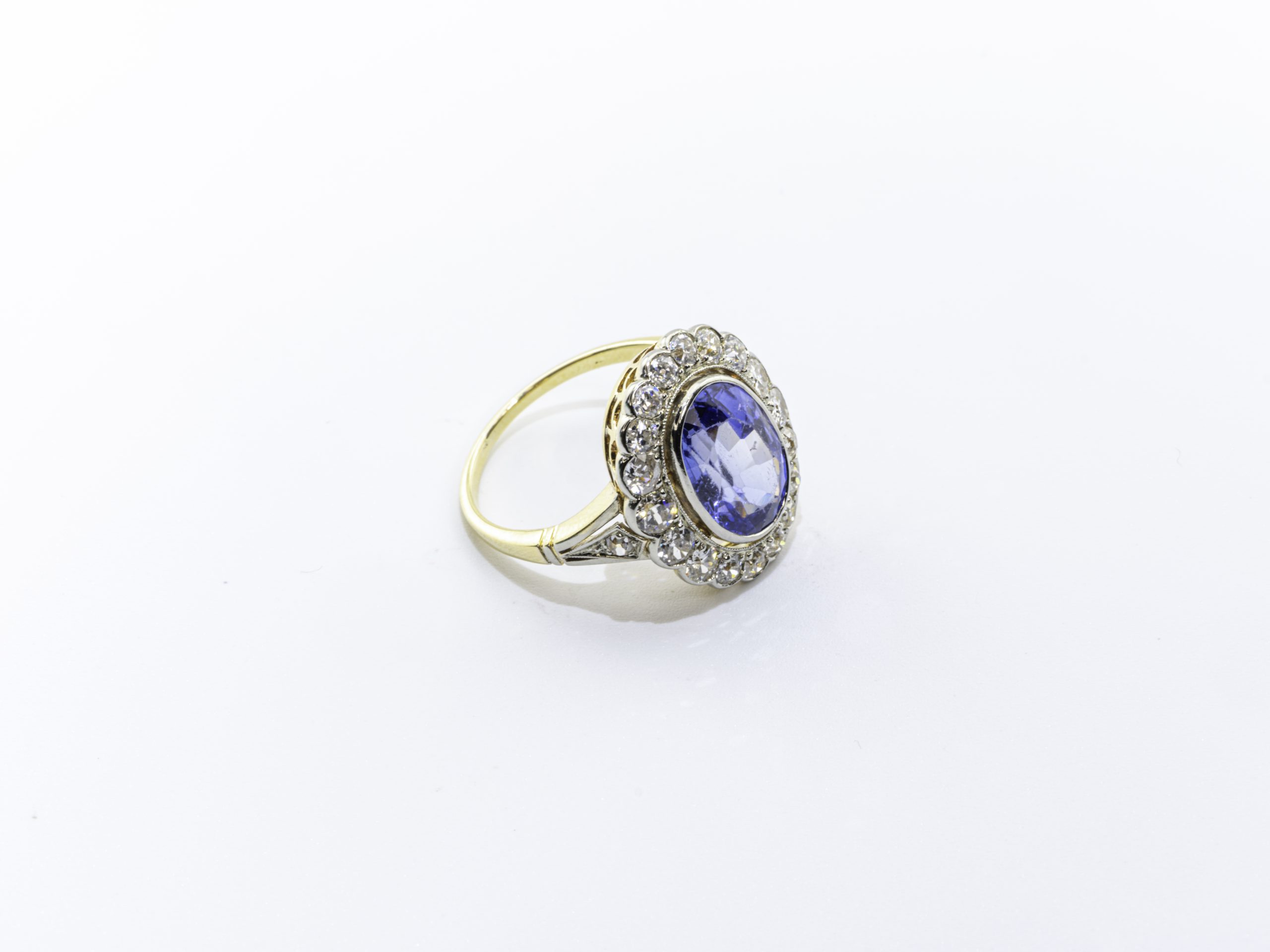 Blitzende Altschliff Diamanten umgeben den farbenprächtigen Mittelstein und machen den Ring zu einem klassischen Entouragering.