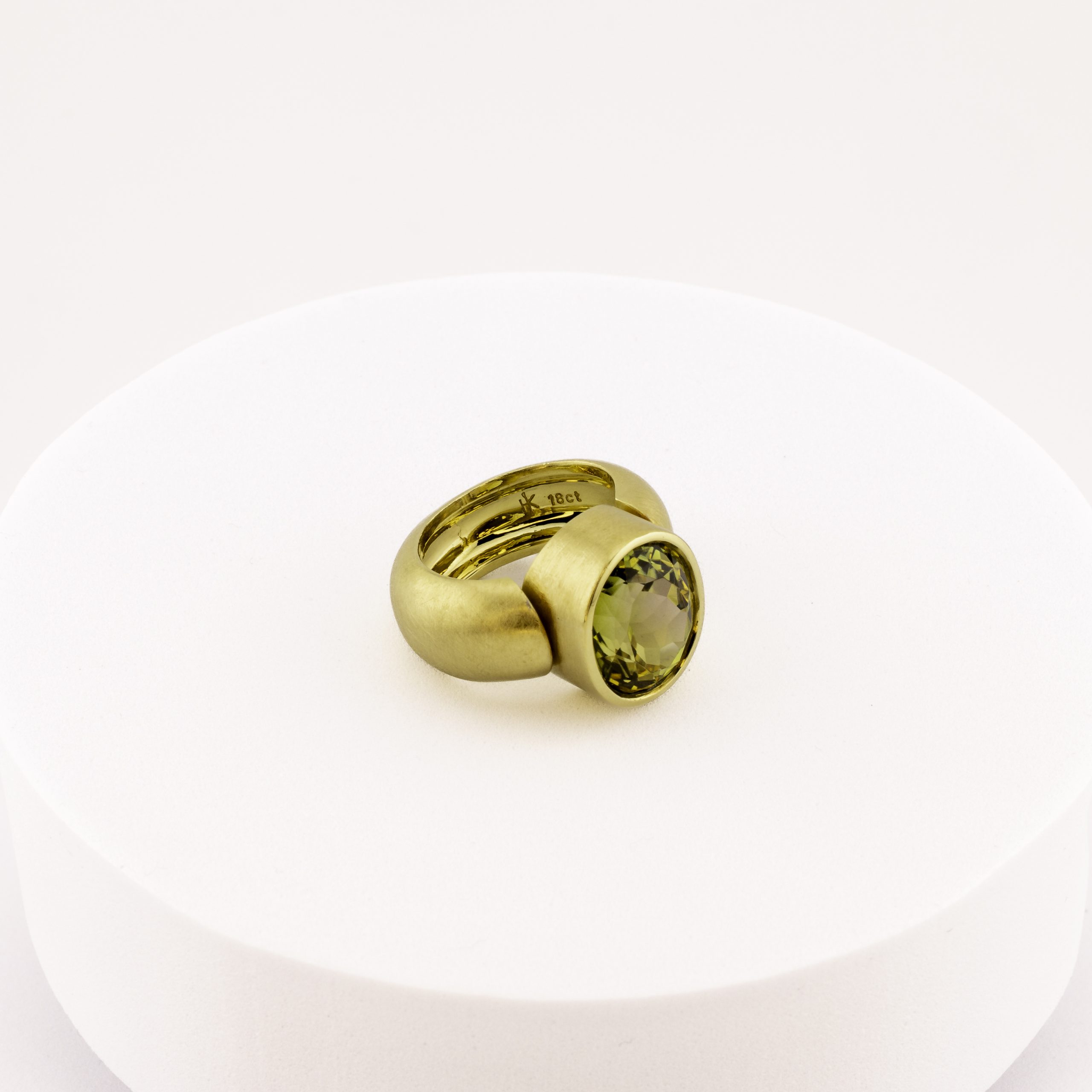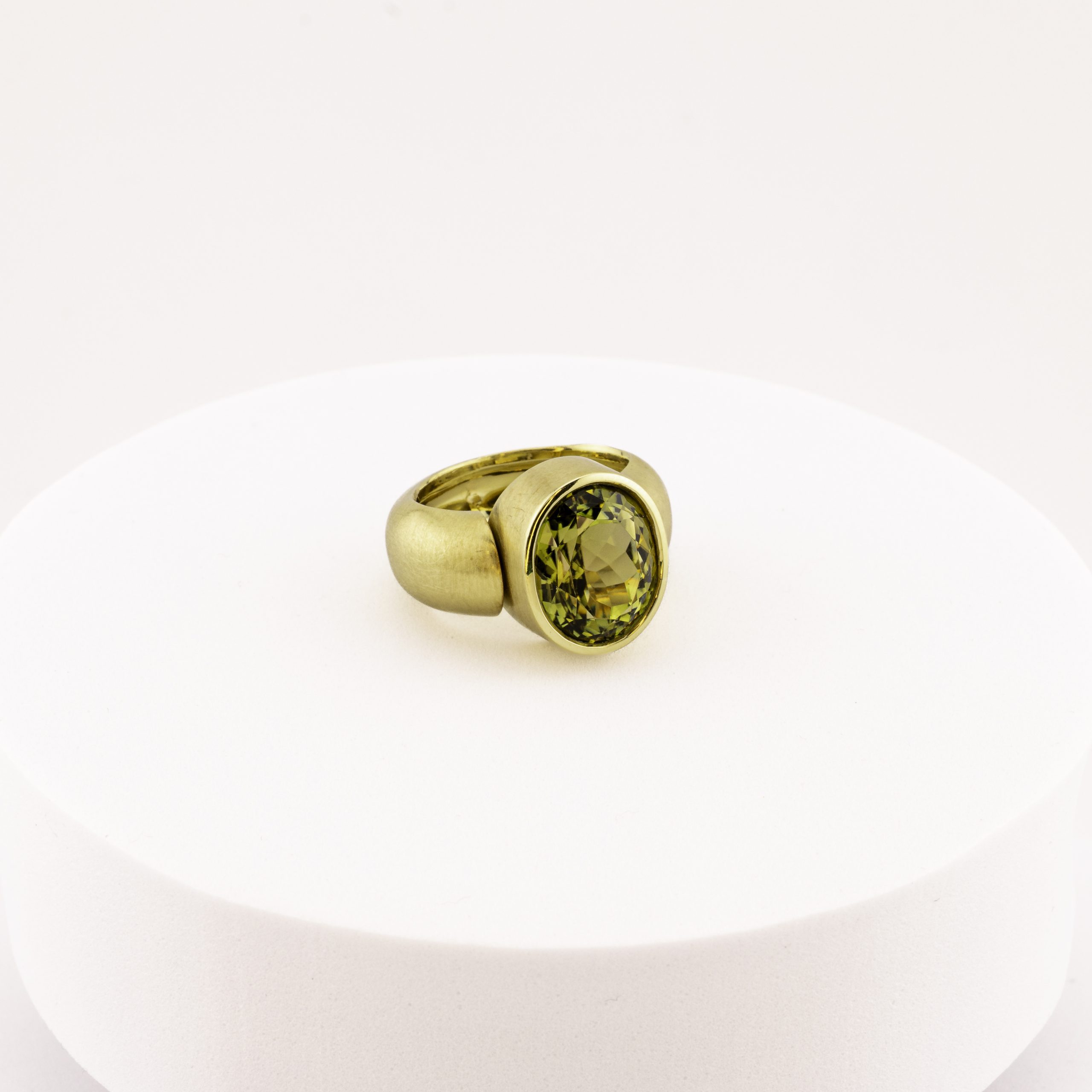 Unser farbintensiver Stein ist in massives, reizvoll mattiertes 750 Gelbgold eingebettet und sitzt präsent und perfekt am Finger!