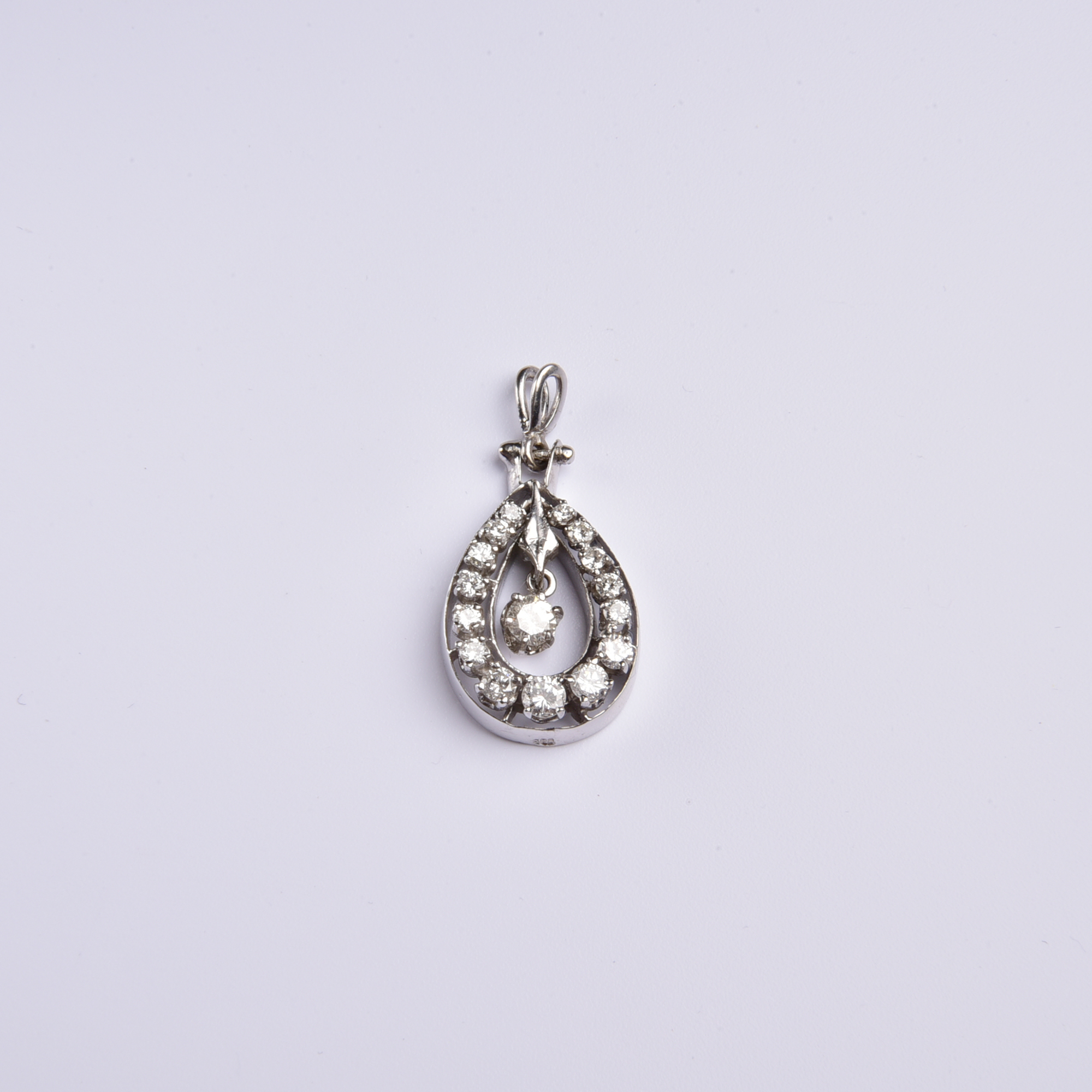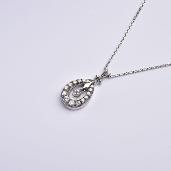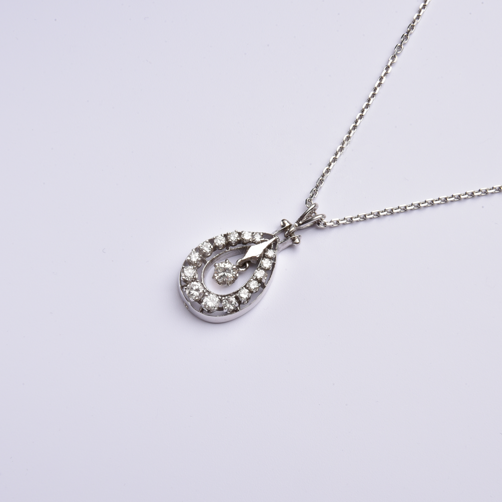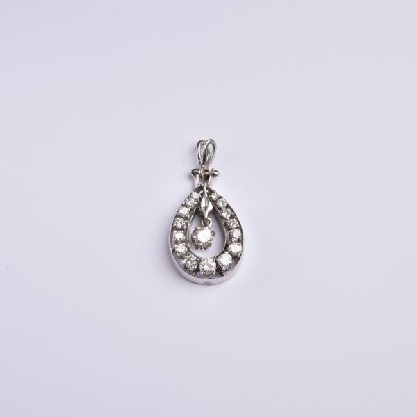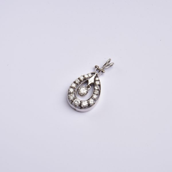 Hochwertig in 585 Weißgold gestaltet zeigt sich ein großer Tropfen, der exquisit mit leuchtenden Brillanten von insgesamt stattlichen 1,00ct. belegt ist – ein frei pendelnder Brillant bildet den strahlenden Mittelpunkt.