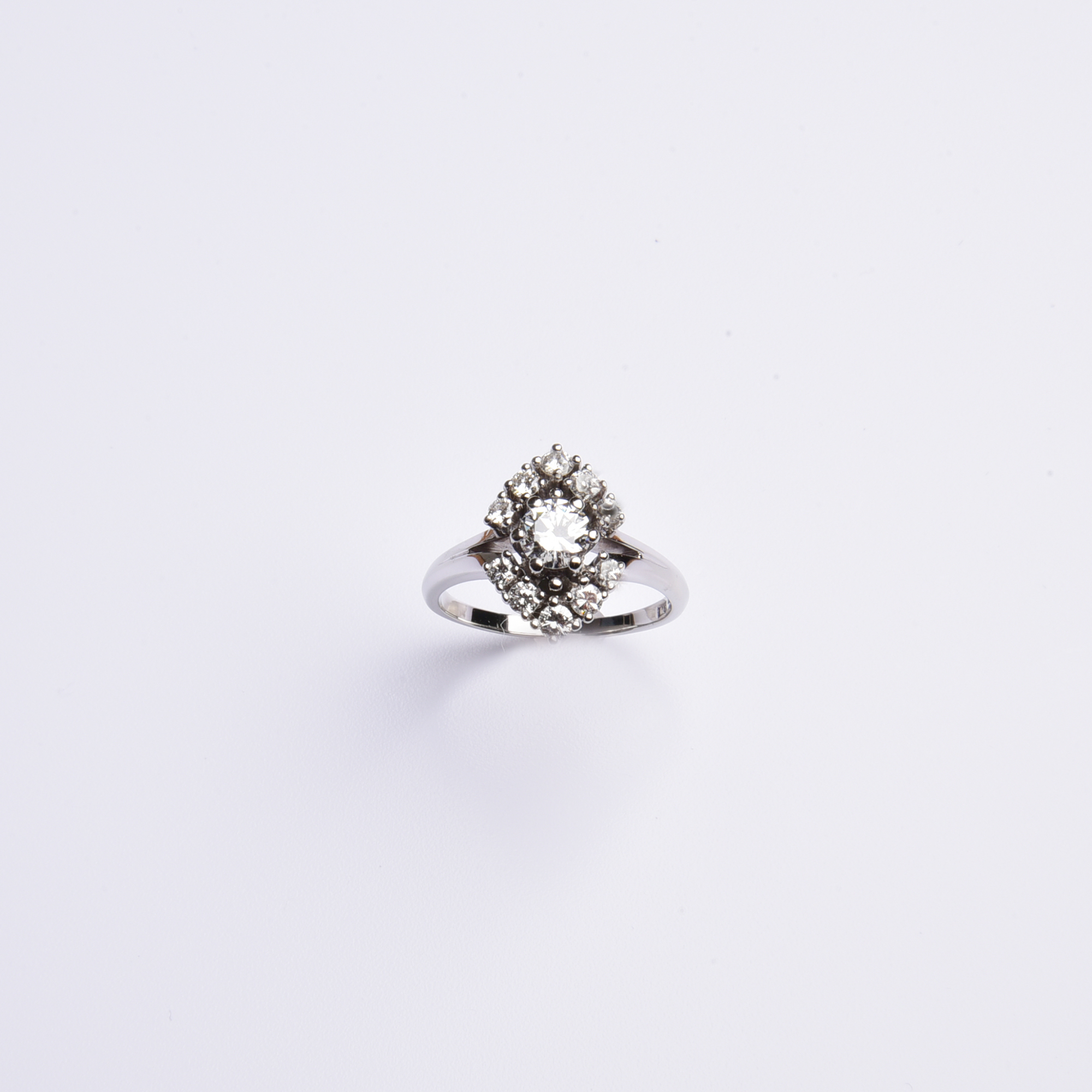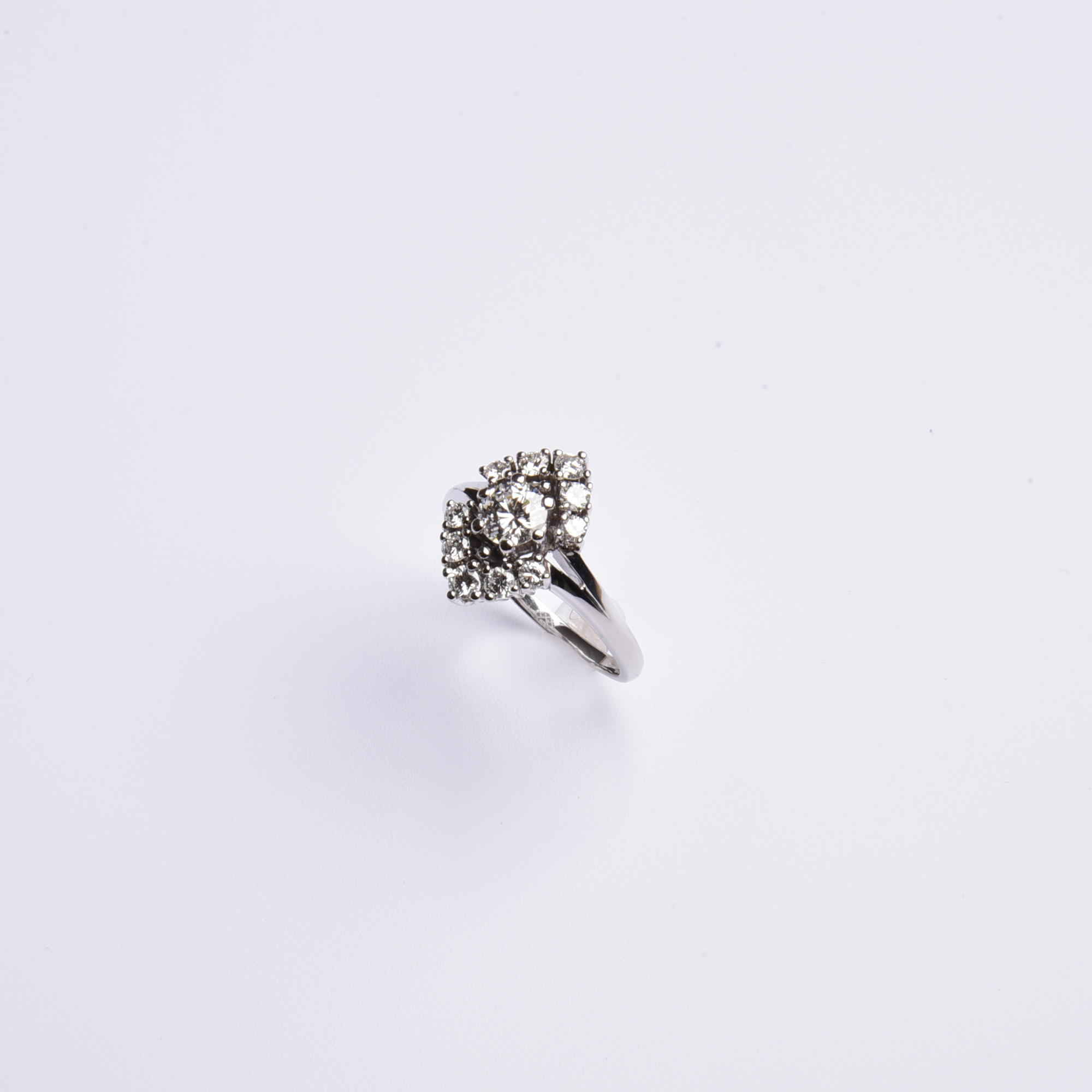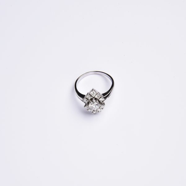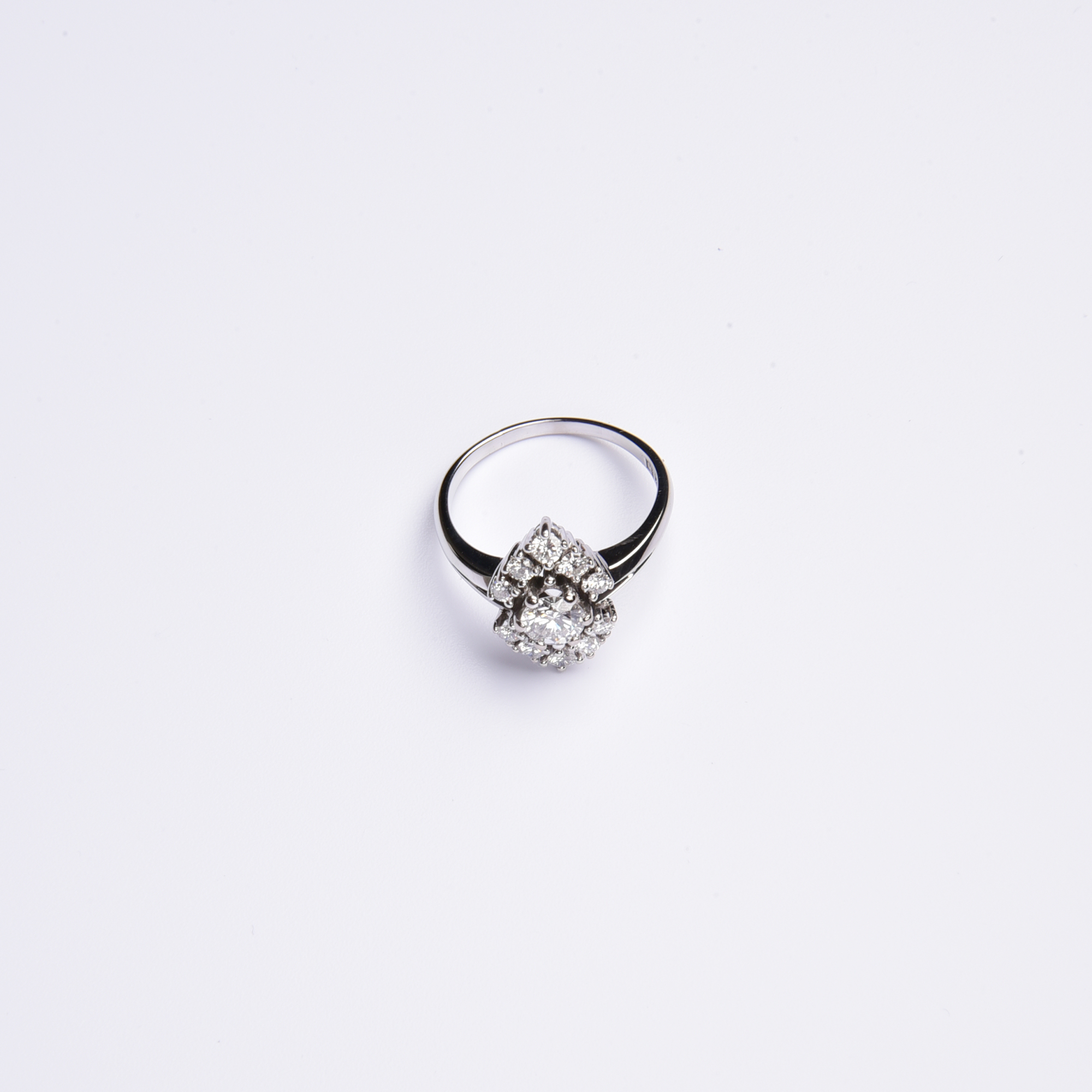 Ein großer Brillant in stabiler Achtkrappenfassung besetzt imposant die Mitte des Entwurfs und wird von zehn kleineren Brillanten über Eck begleitet, was dem Design eine extravagante Note verleiht.