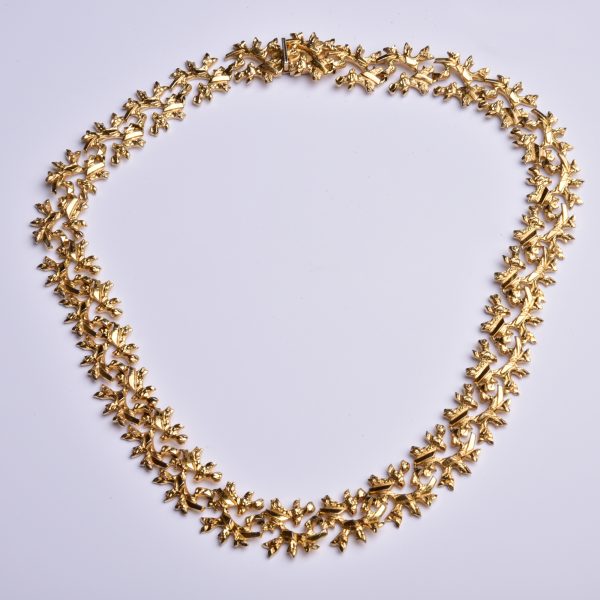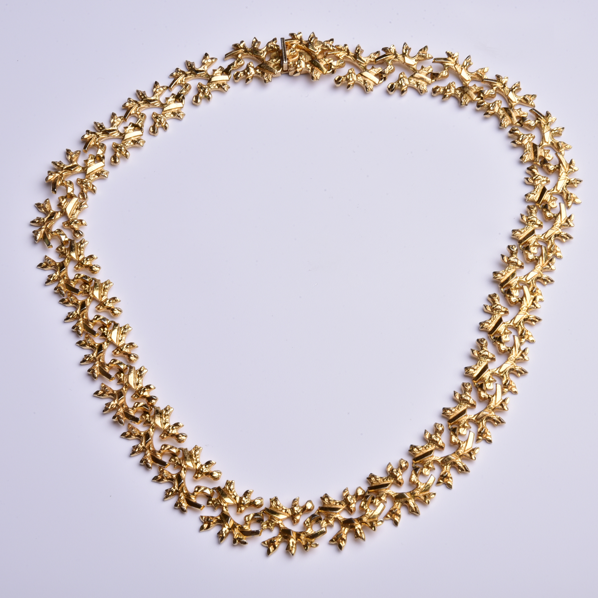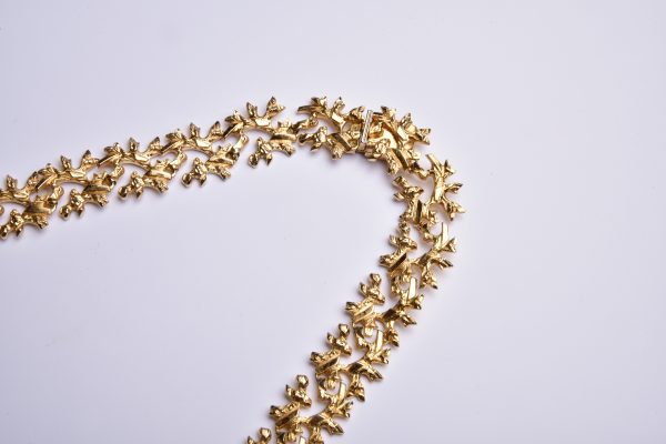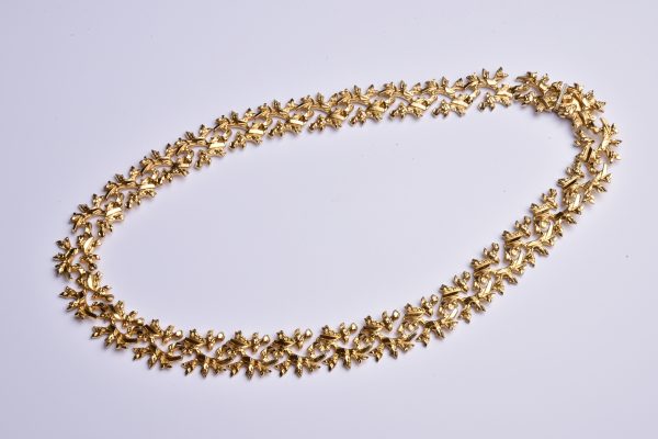 Wir präsentieren Ihnen hier ein wunderbares Collier – original aus den 1960er Jahren – mit anspruchsvoller Ornamentik, geschlossen wird das Schmuckstück mit einem fast unsichtbaren, integrierten Steckverschluss.