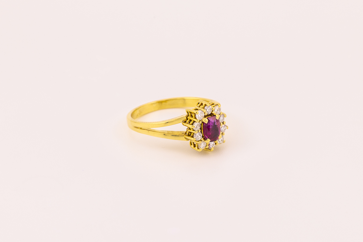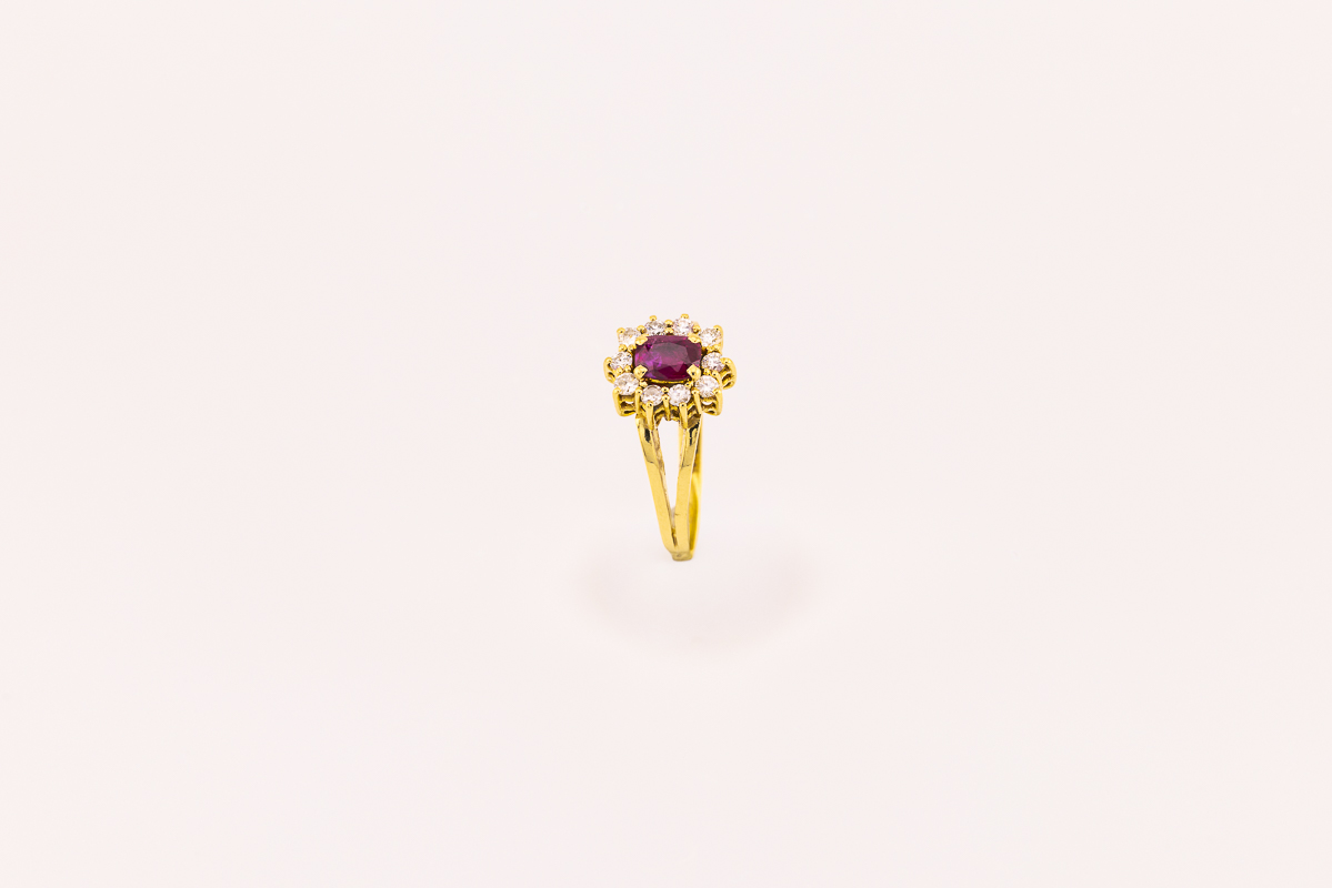 Er zeigt sich in Form eines edlen Ovals, reich facettiert und umrahmt von strahlend weißen Brillanten in ausgesuchter Qualität.