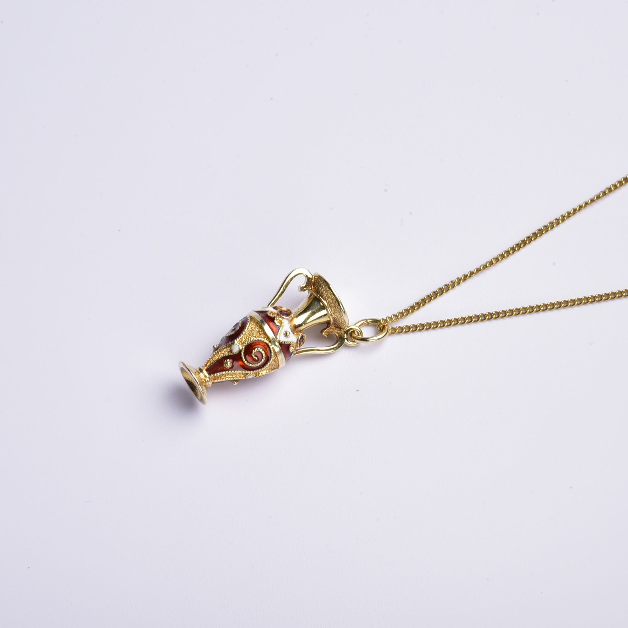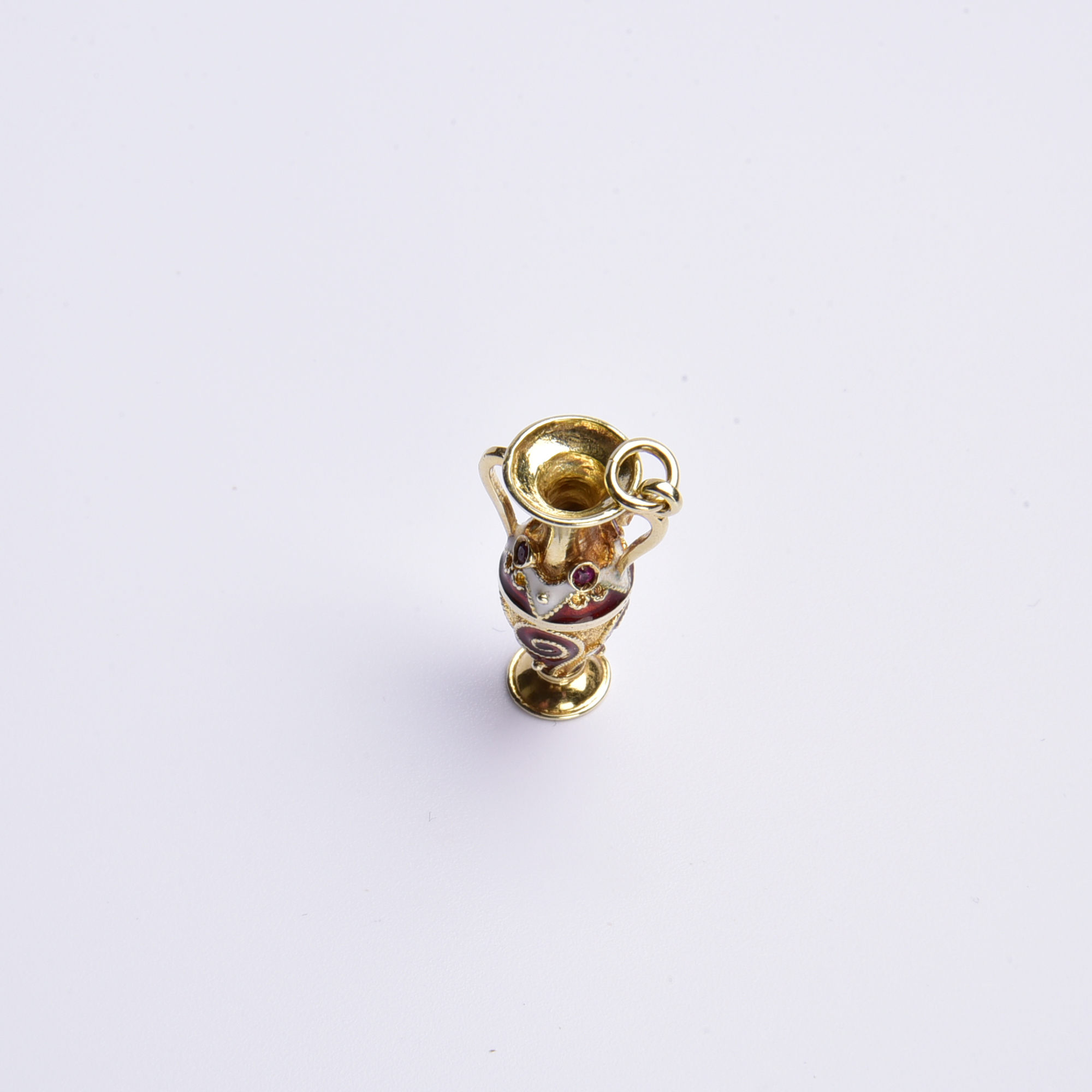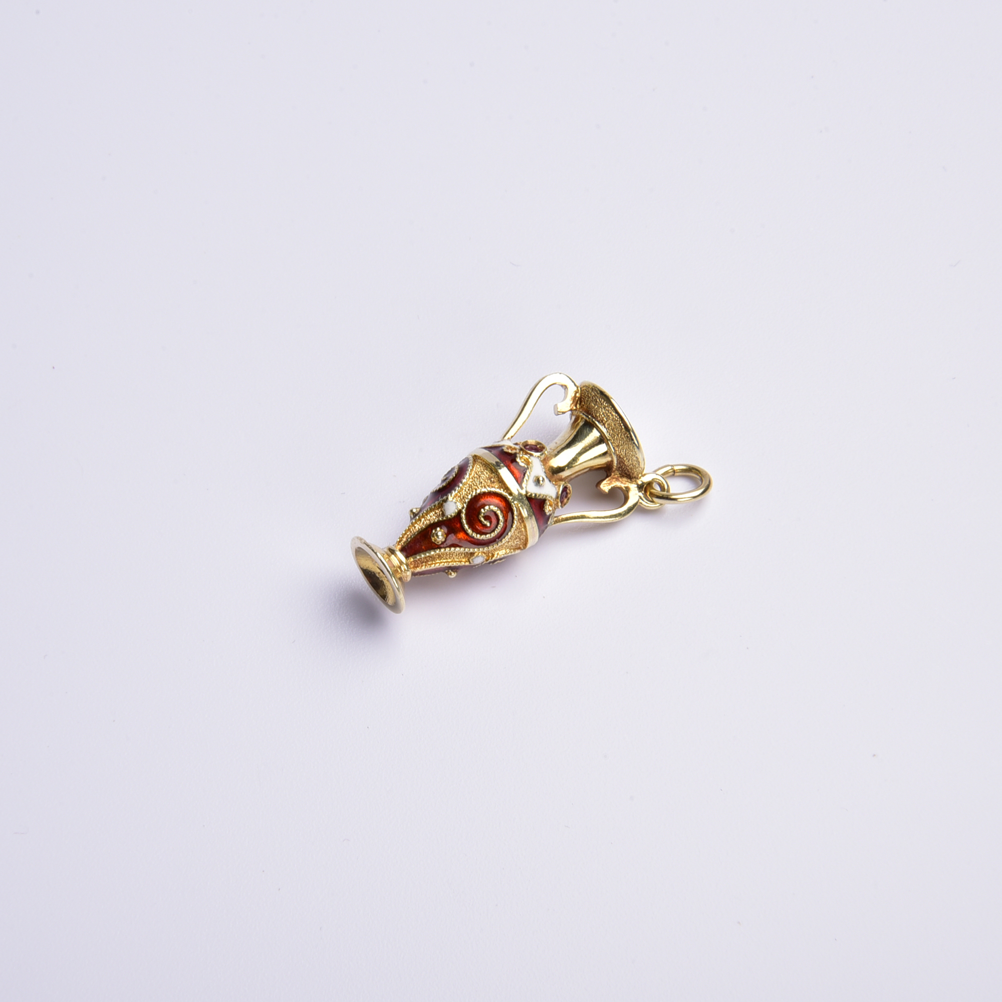Hochwertig und liebevoll in 585 Gelbgold gestaltet, schmücken zarte Millegriffes und wunderschöne Emaillearbeiten unseren attraktiven Anhänger.