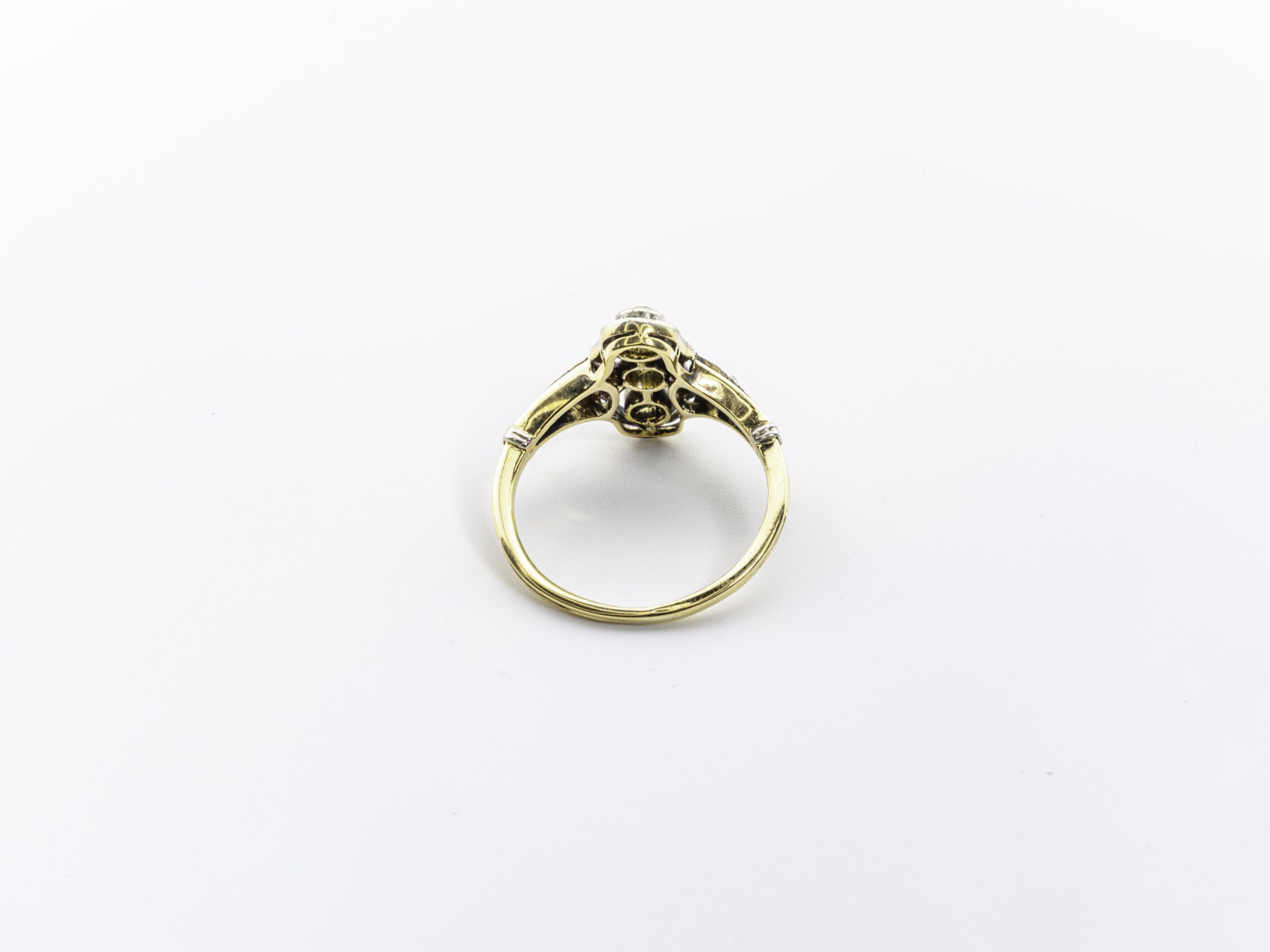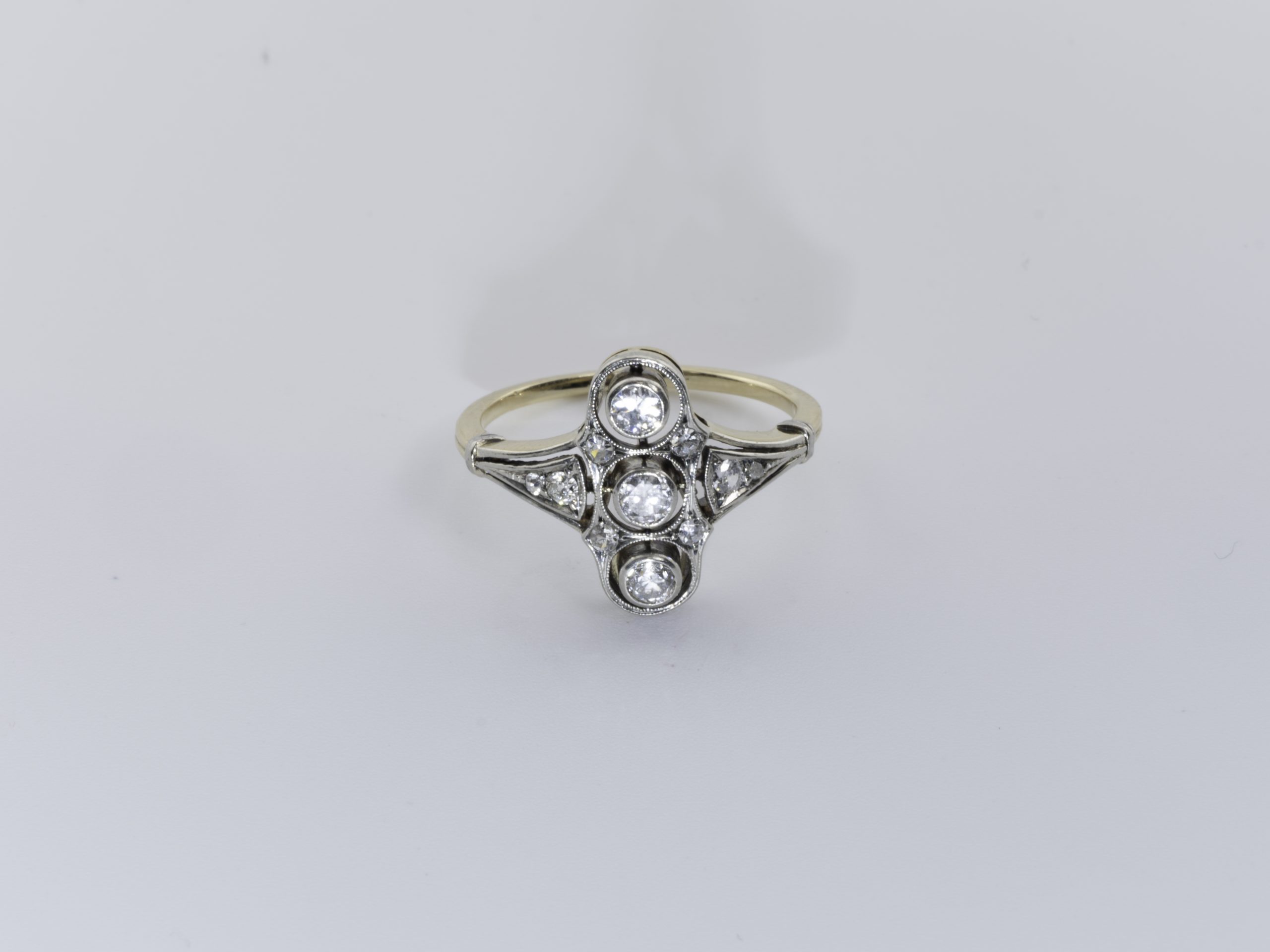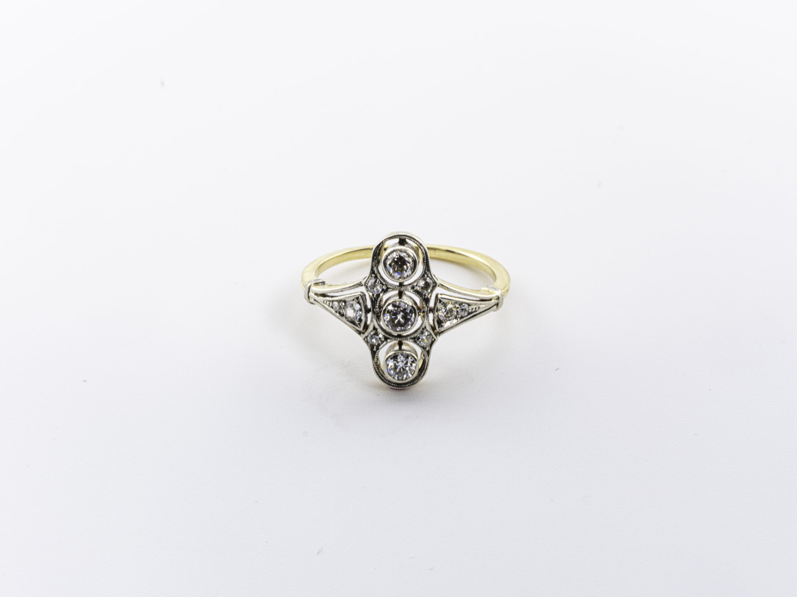 Dieses können wir auch bei dem hier vorliegenden Ring beobachten – drei strahlende Altschliff Diamanten (Old European Cut) und zahlreiche, weich schimmernde Diamantrosen zieren den Ringkopf, der in kühlem 585 Weißgold gearbeitet ist.