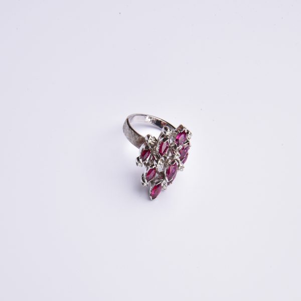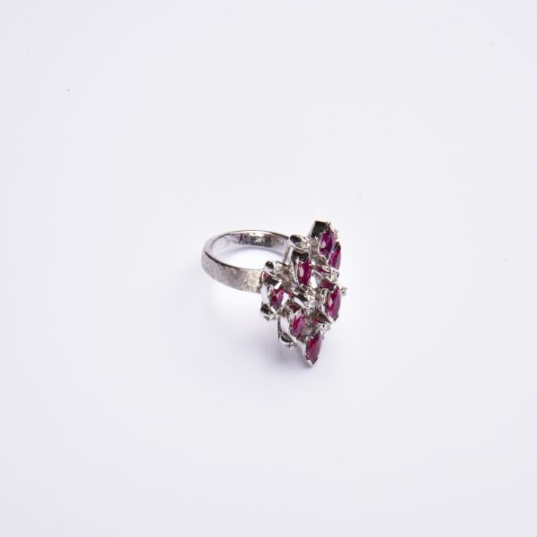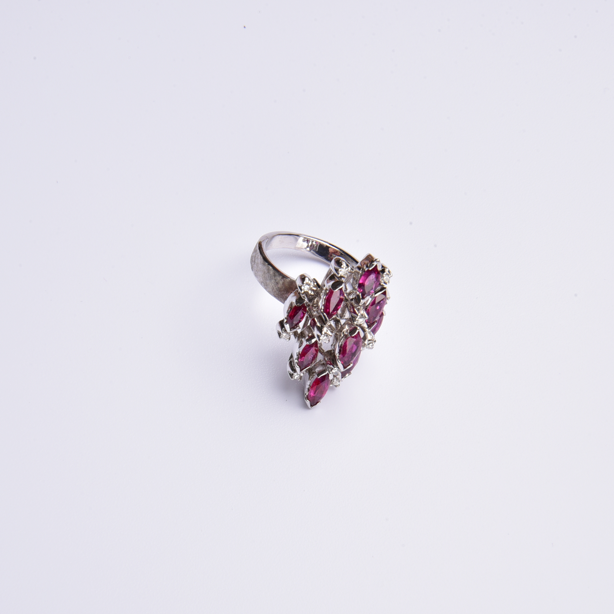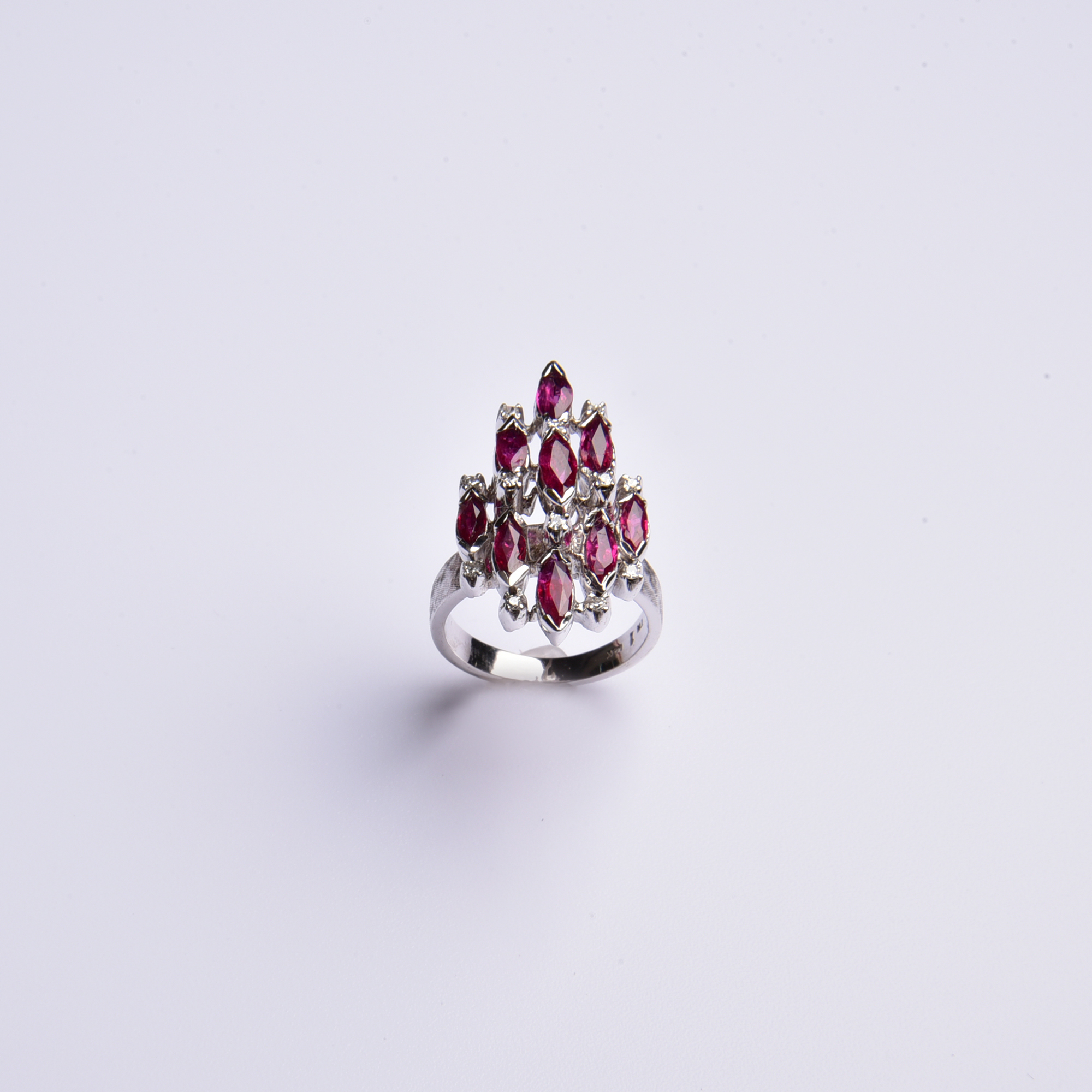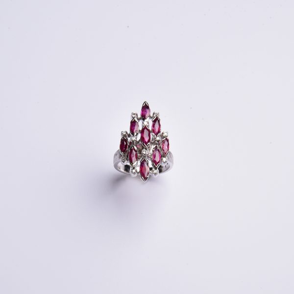 Unser Schmuckstück zeigt sich im Licht strahlend roter Rubine, die als schöne Doppelung ebenfalls in Navetteform geschliffen wurden.