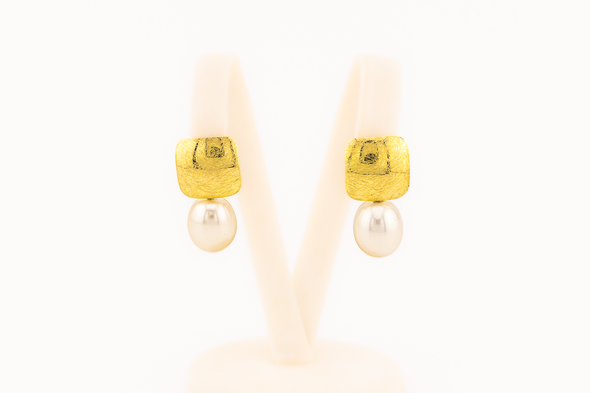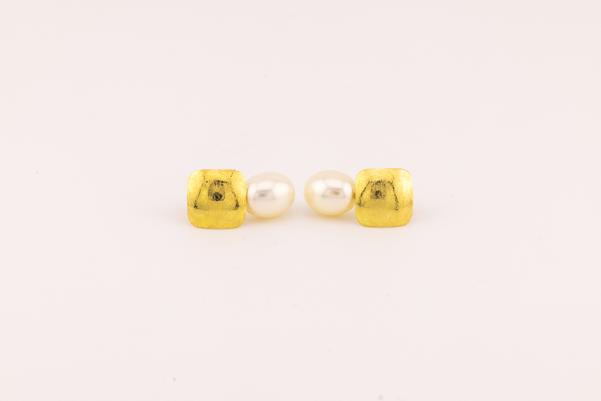 An einem weich schraffiertem, goldenen Viereck pendeln frei beweglich wunderbare Süßwasserperlen in Tropfenform.