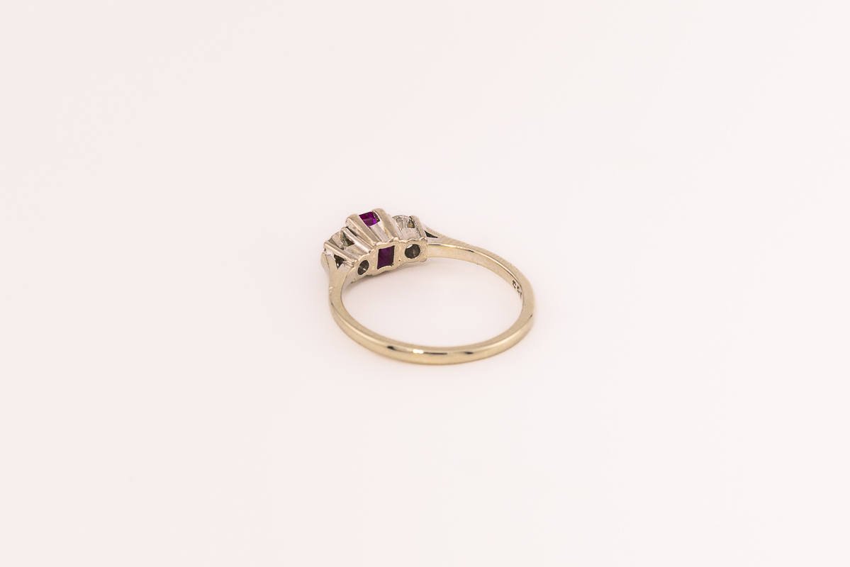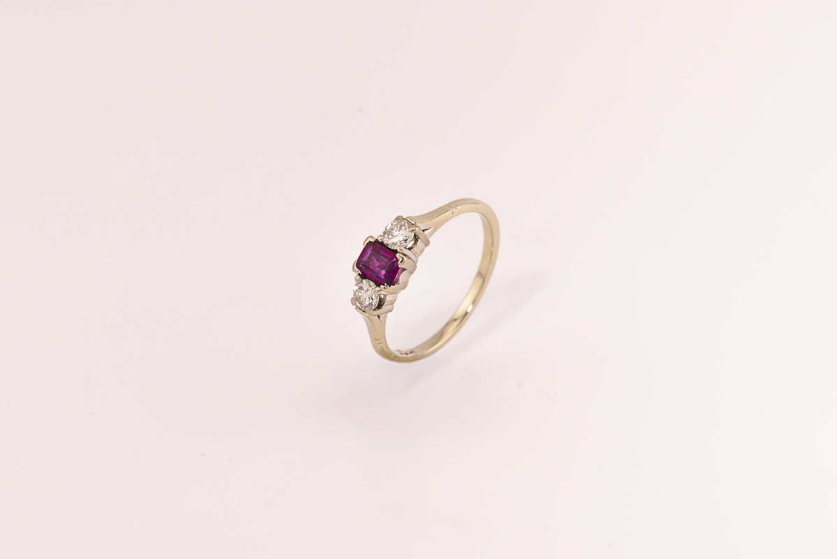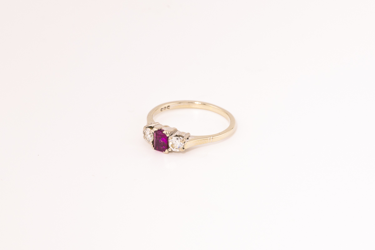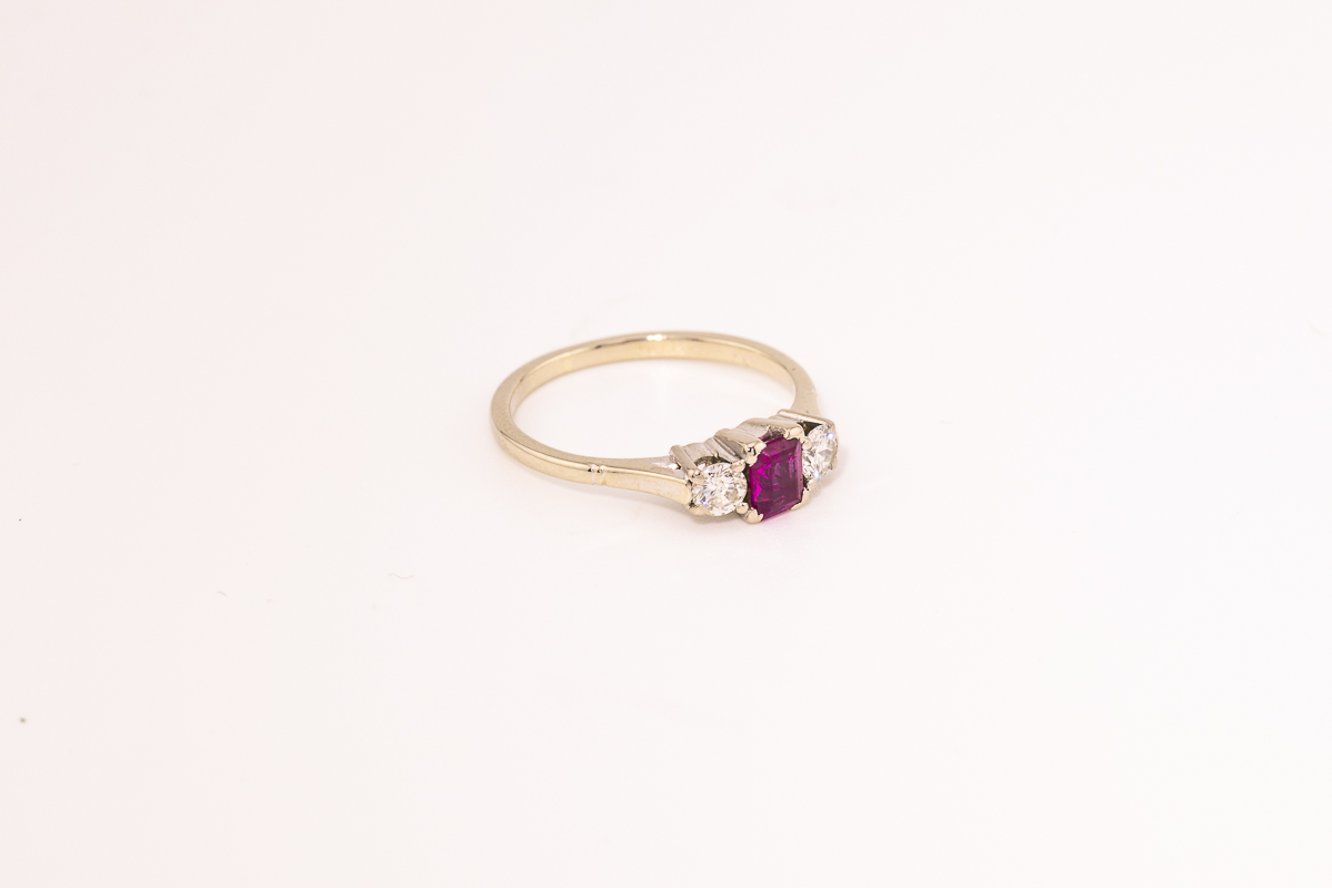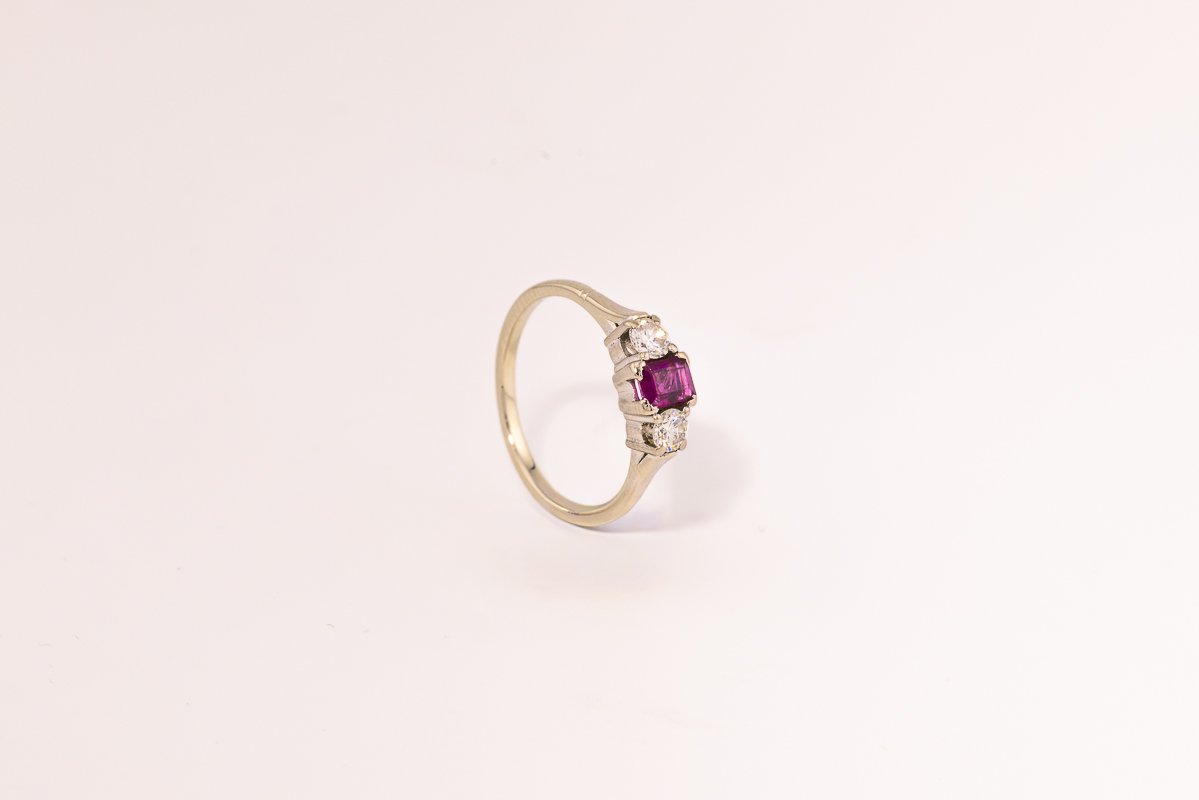 Der hier gezeigte Ring präsentiert einen schön facettierten Rubin von intensivem Rot, umrahmt von zwei blitzenden Brillanten.