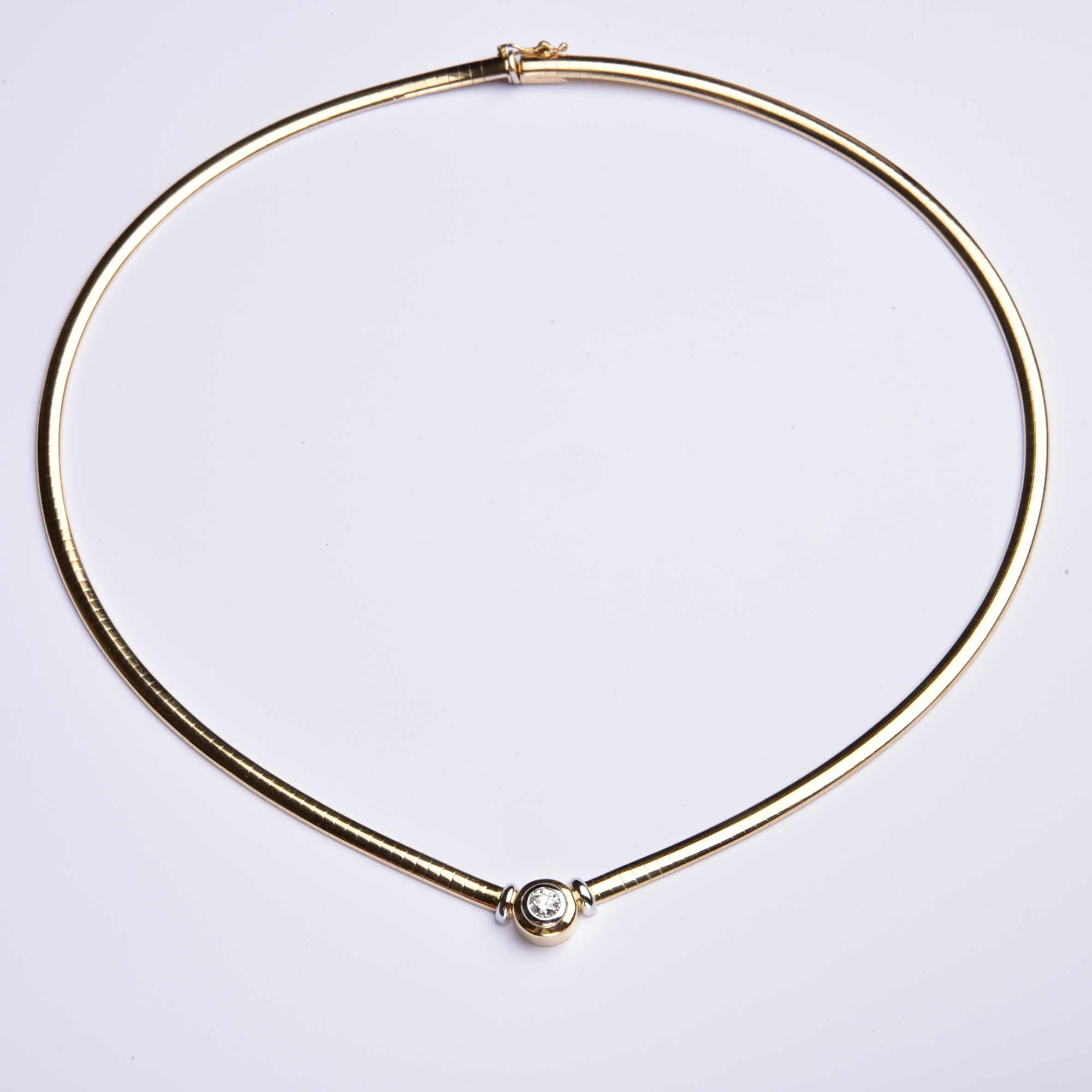Der wunderbare Entwurf, der mit seiner bestechenden Klarheit überzeugt, zeigt einen weich beweglichen Reif, der in seiner Mitte einen großen Brillant als Solitär präsentiert.