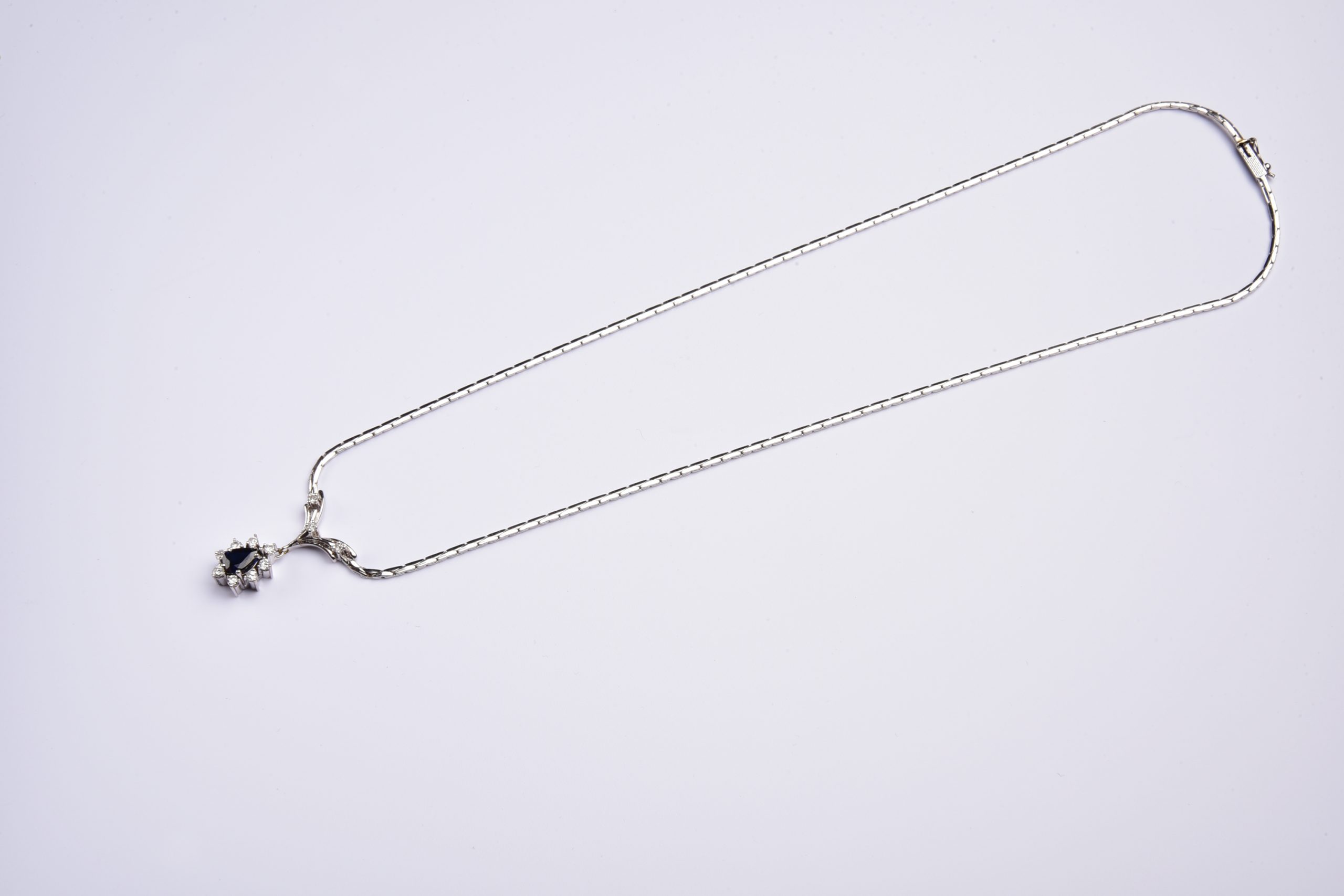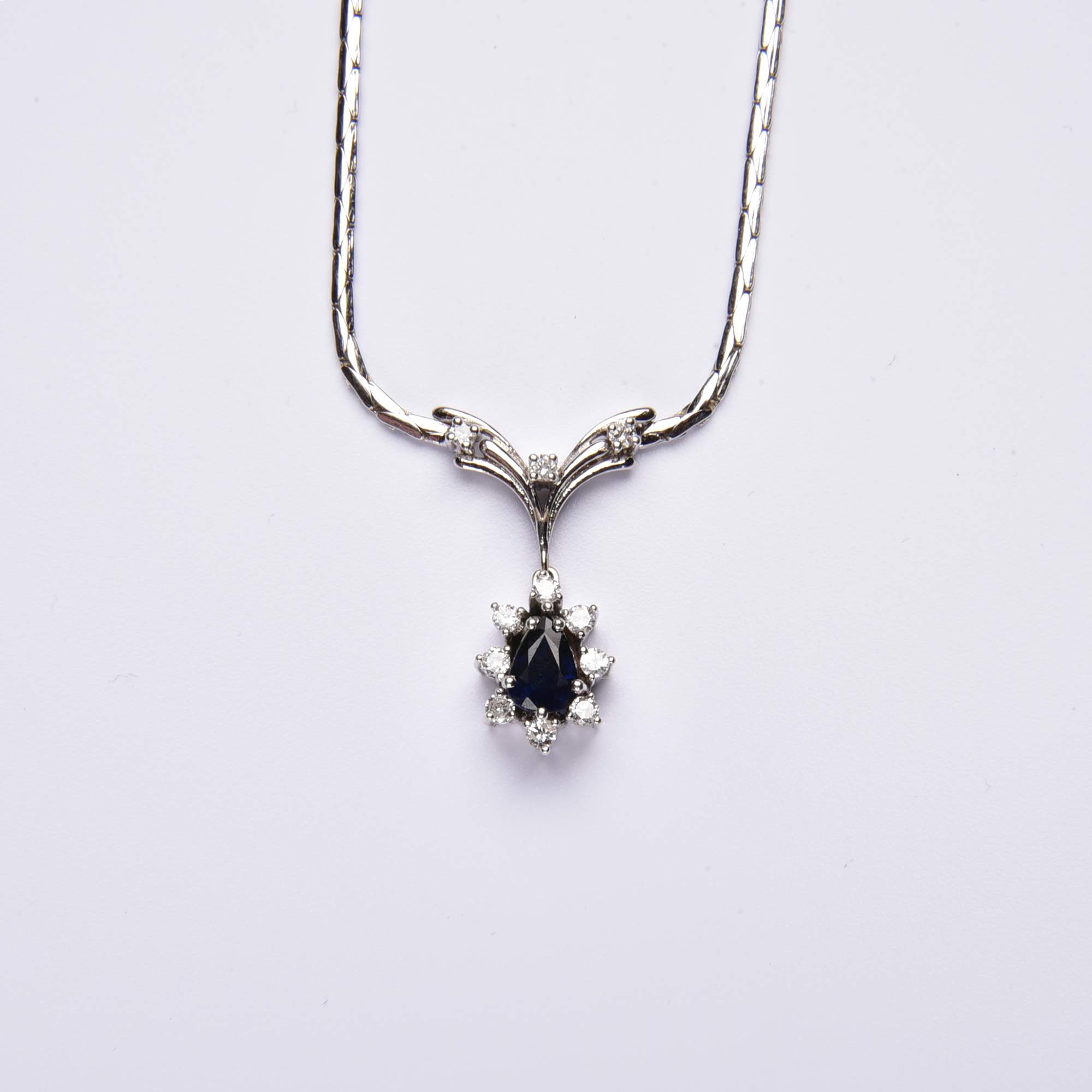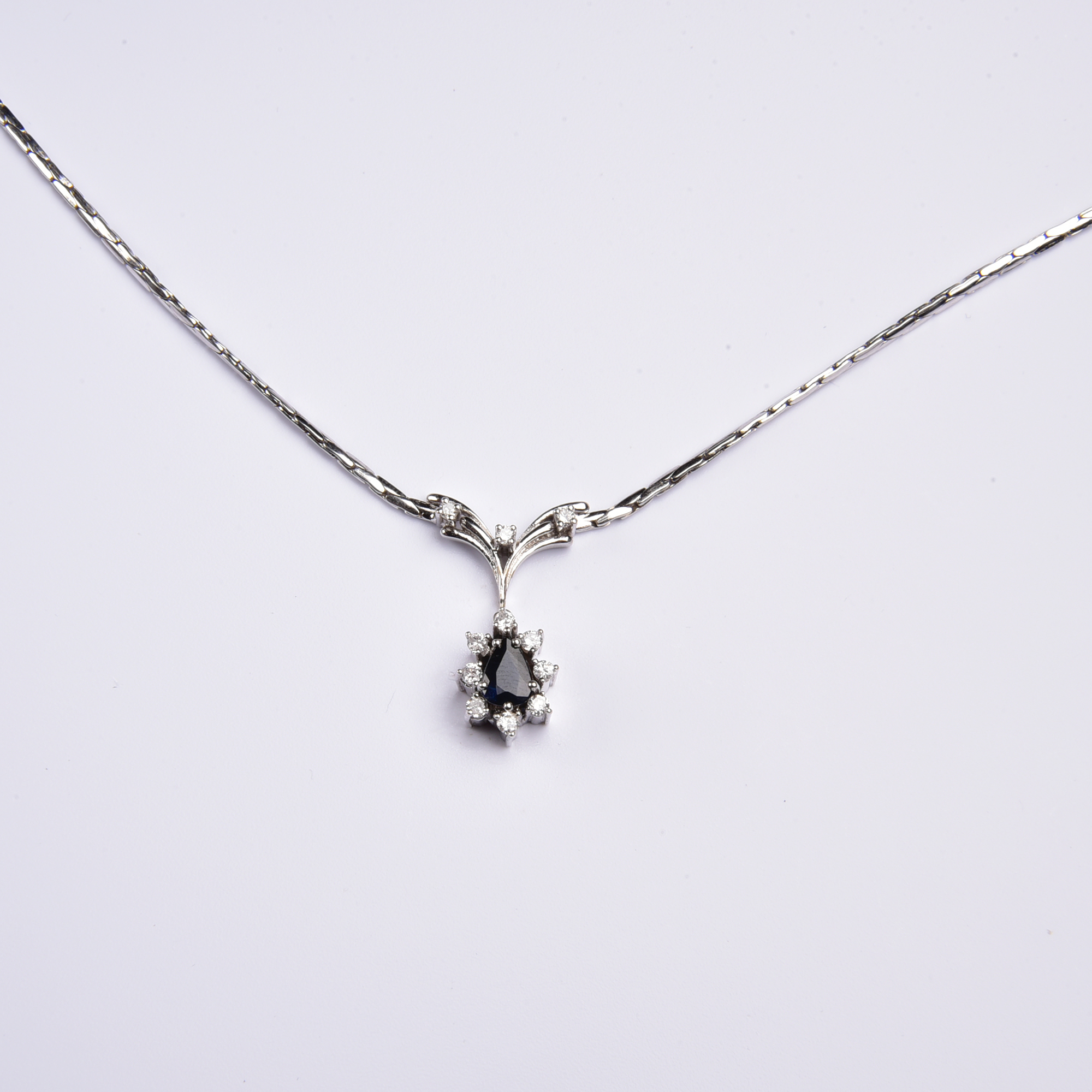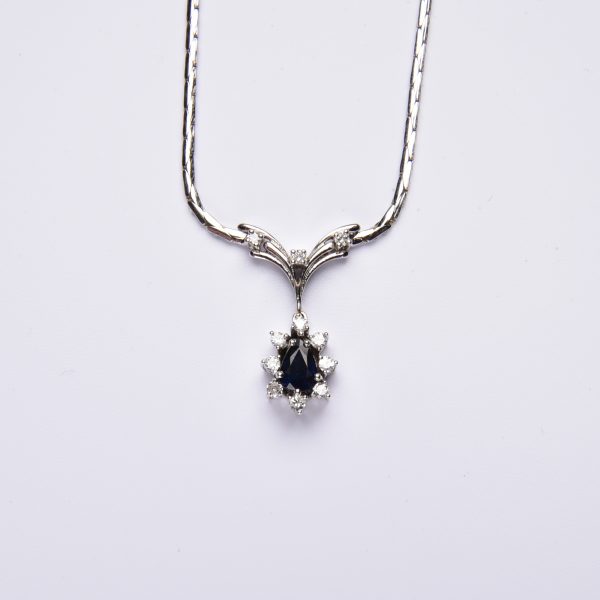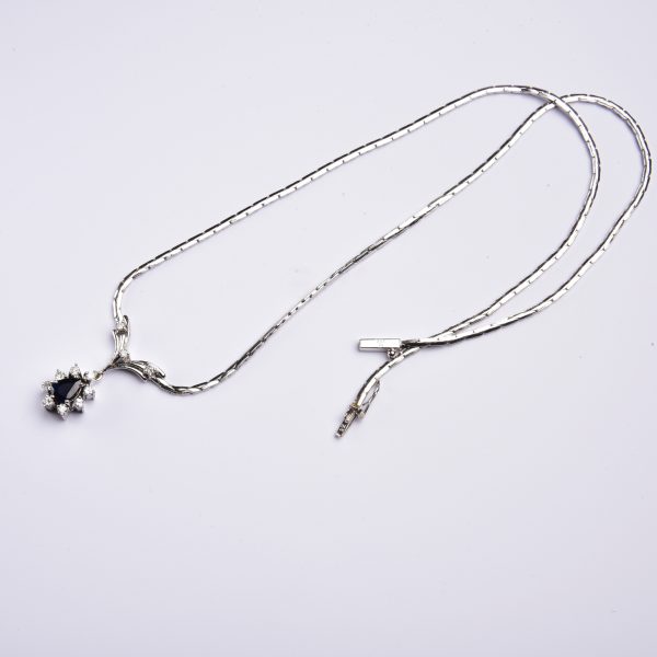 An einer beweglichen Gliederkette strahlt ein wunderbares Schaustück, an dem ein tiefblauer Saphir Tropfen von gleißend hellen Brillanten entouriert wird, die das Licht in schimmernden Facetten tanzen lassen.