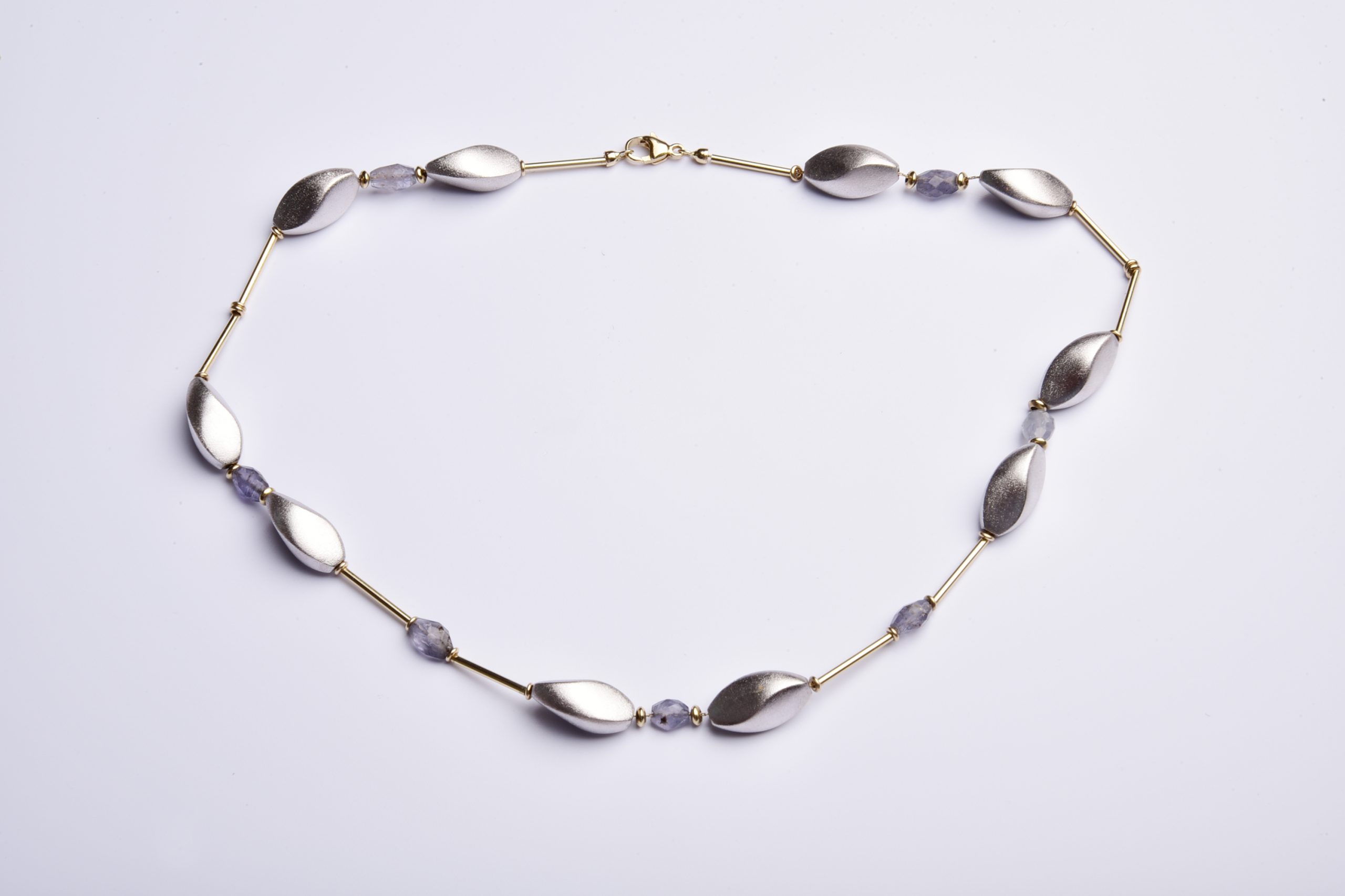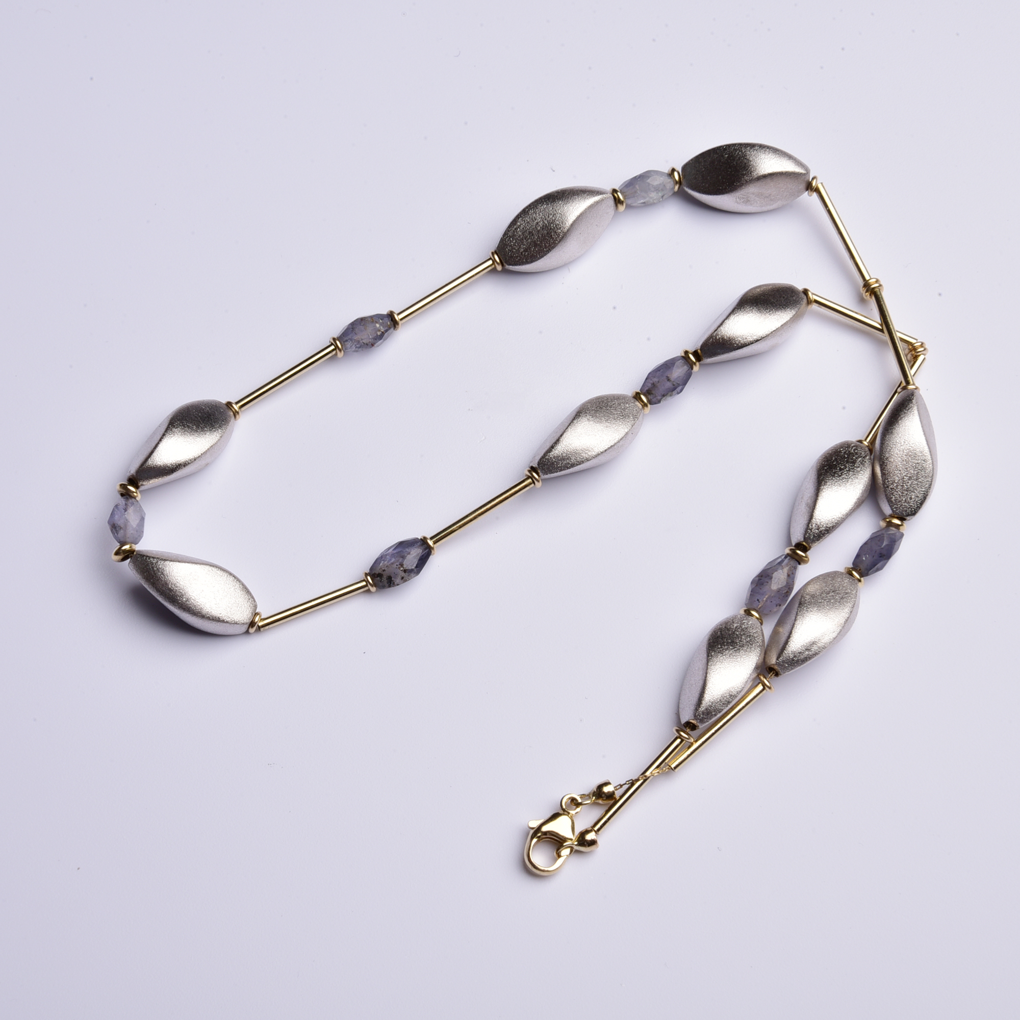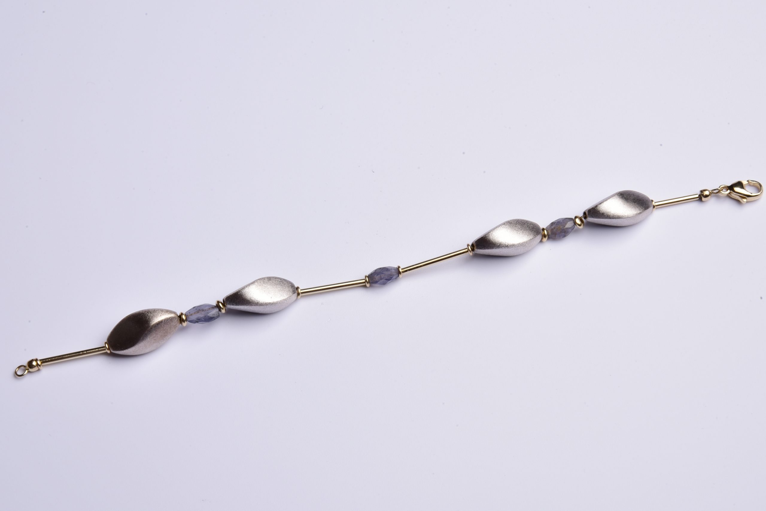 Verbunden durch feine Goldstäbe in warmem 585 Gelbgold leuchten uns helle, attraktiv mattierte Goldelemente in kühlem 585 Weißgold und schön facettierte Achate wie blitzende Lichtpunkte entgegen.
