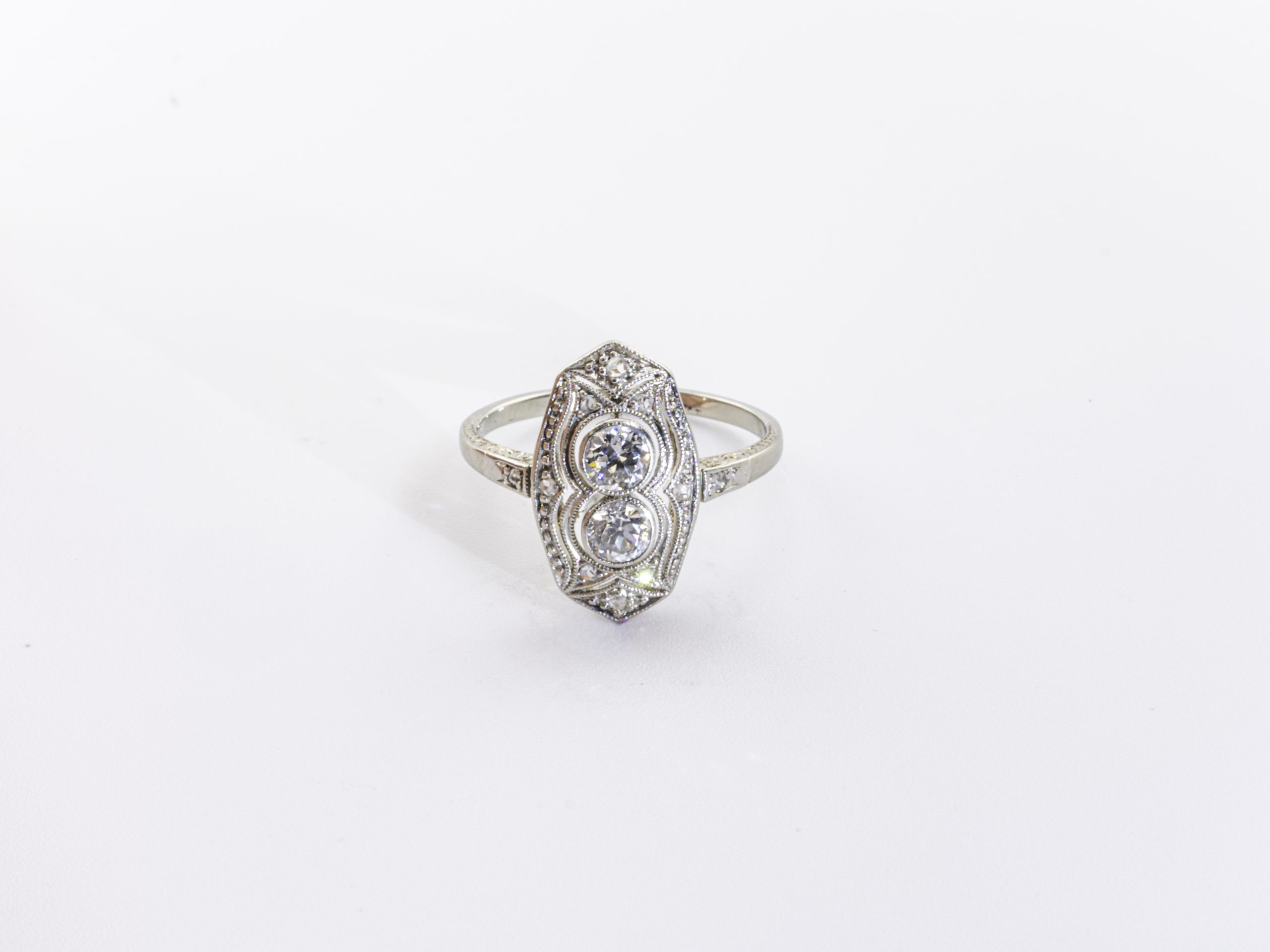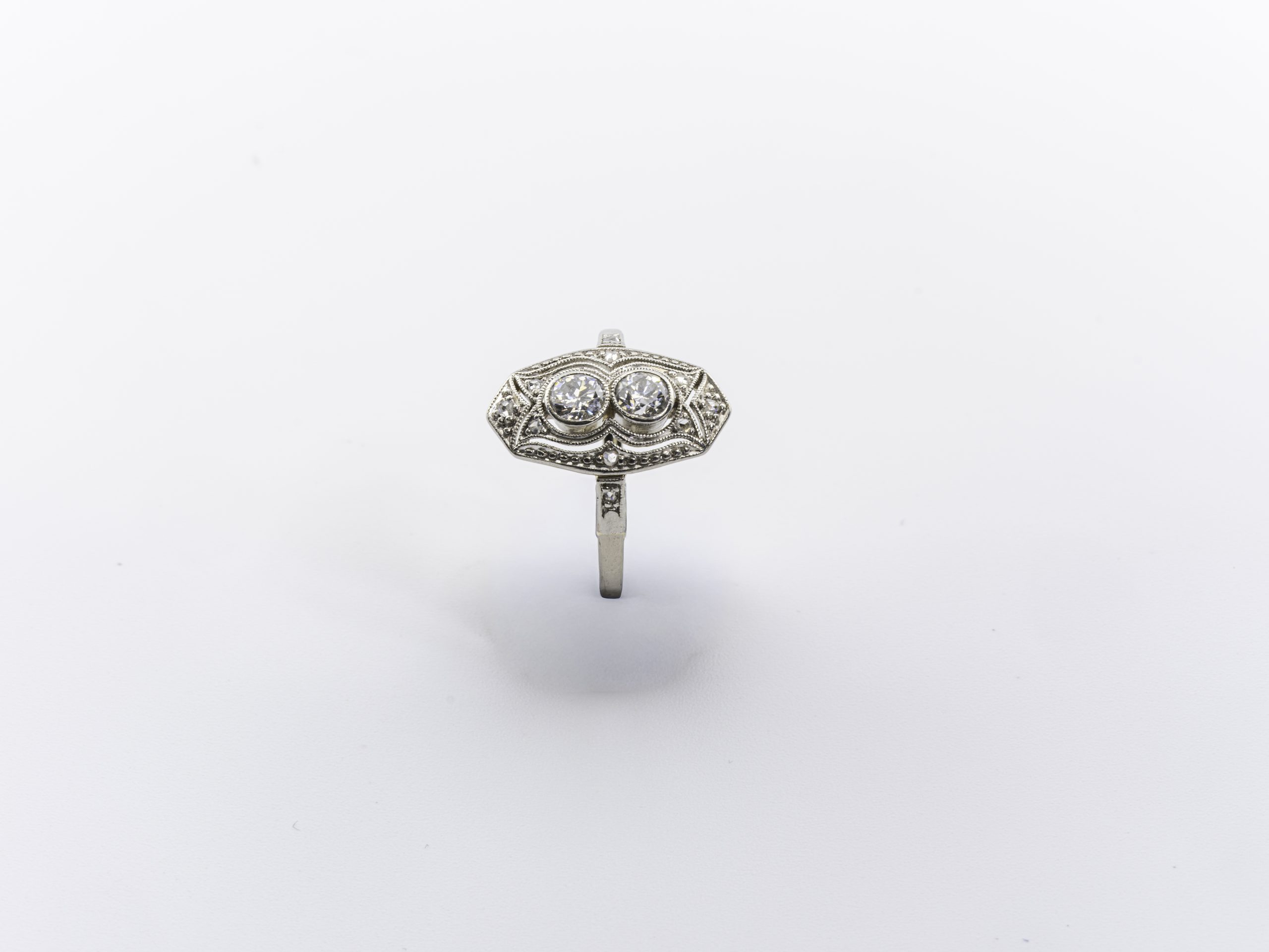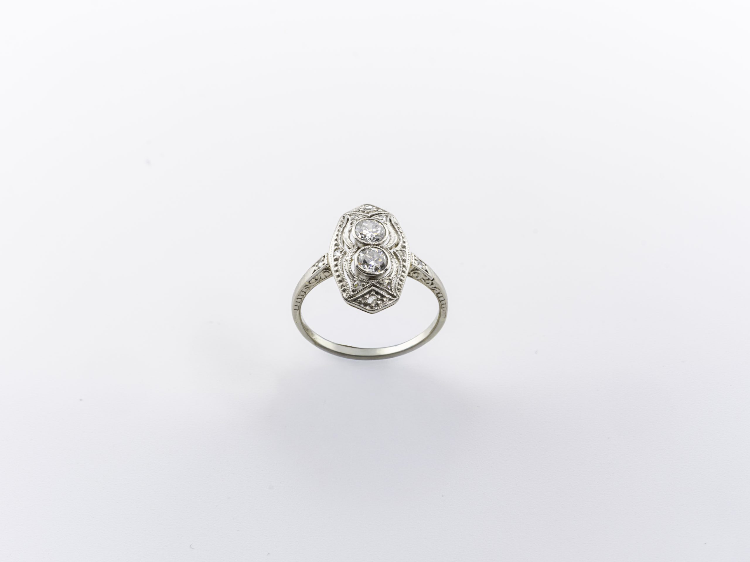 Im Zentrum funkeln zwei Diamanten im klassischen Altschliff, begleitet von grazilen Millegriffes – zarte Diamantrosen verleihen dem Ring eine zusätzliche Lebendigkeit.