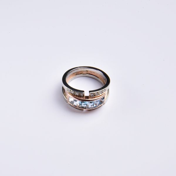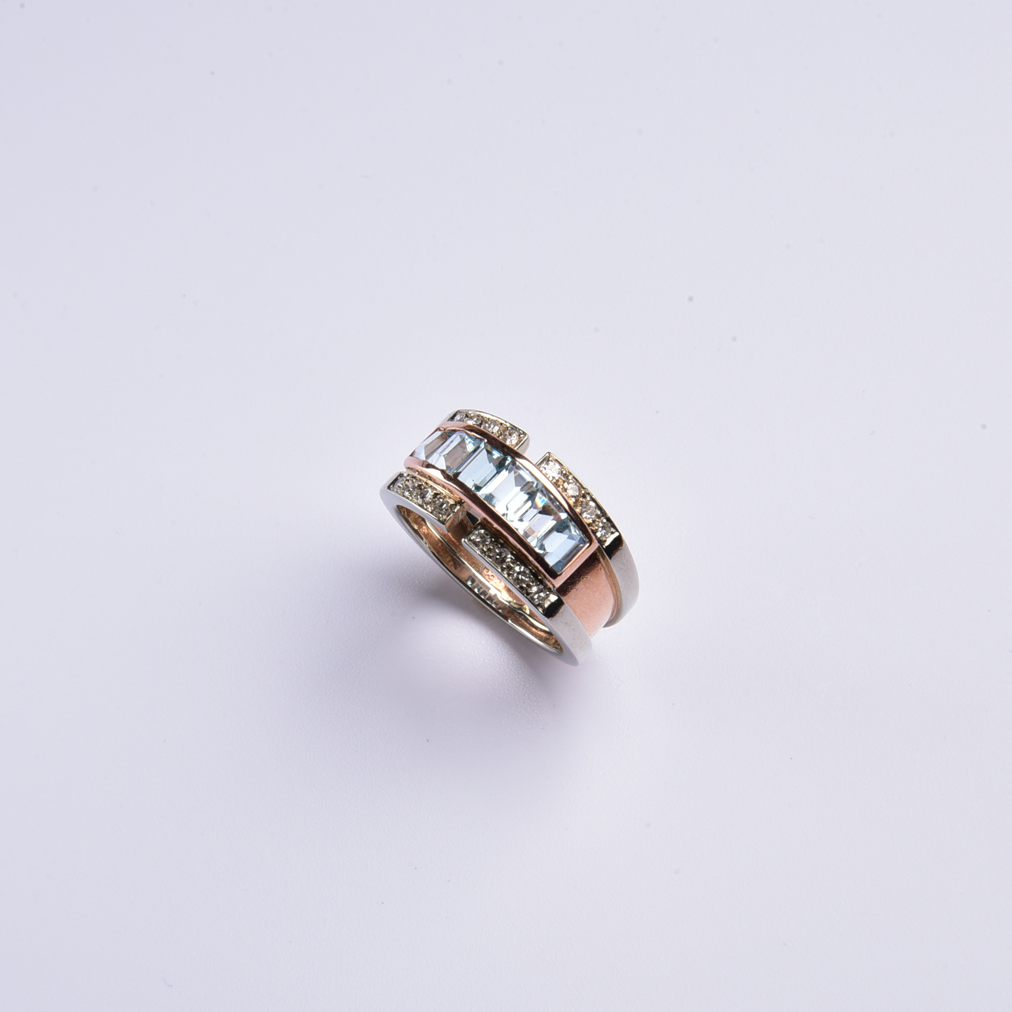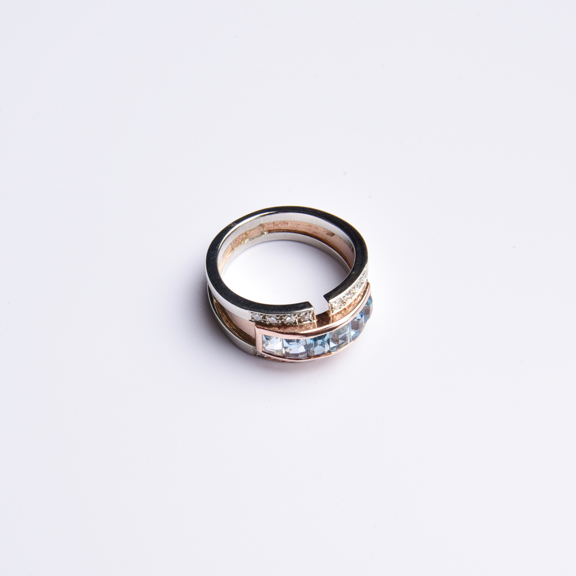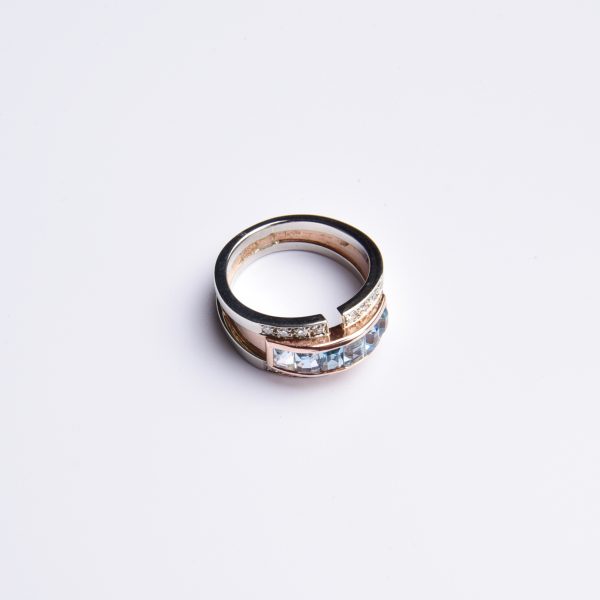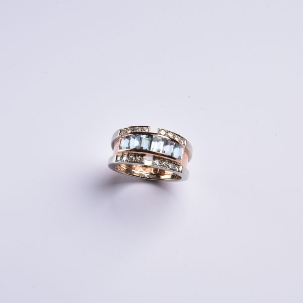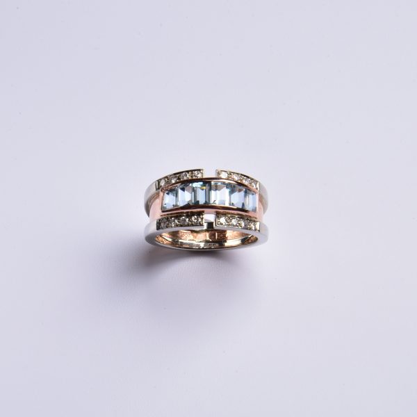Bei diesem extravaganten Ring wurden wasserblau leuchtende, fein facettierte synth. Aquamarine in eine weich schimmernde Rotgoldfassung gesetzt – eine spannende Idee, denn so wird das himmlische Blau der Steine perfekt in Szene gesetzt.
